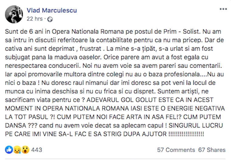 Despre aceeași atmosferă tensionată vorbesc și Vlad Mărculescu, prim solist al Operei, și maestrul de balet Dan Berihoi. Balerinul Vlad Mărculescu s-a întors la Iași, orașul lui natal, în urmă cu 6 ani, după ce a fost angajat la Opera din Budapesta și după mai multe experiențe avute ca artist pe scene din SUA și Rusia. „Adevărul e că eu de ani de zile am fost redus la tăcere și n-am avut niciodată dreptul să zic nimic. Eu mă duc la locul de muncă cu frică, cu teama să nu fiu denigrat.”