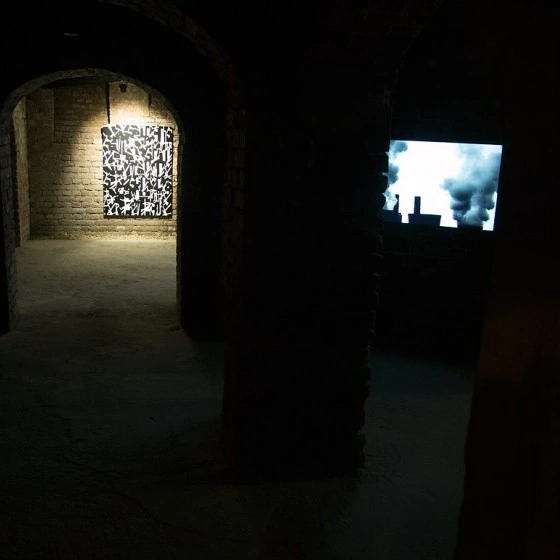 series, depict the beauty of a disaster: a lignite quarry in Germany which, seen from a great distance through the lens, looks like the landforms of an alien planet. But the video installations and the digital ‘writings’ at the basement transport you directly in the depths of the world, as Mouraud says. Pandemonium, a video artwork divided into three screens, showed for the first time too, looks like a moving and sound-making painting that depicts furnaces continuously spitting out dark clouds. I remained minutes in a row in front of the enormous screen on which the work Face to Face is played in a loop, hypnotized by a gigantic iron arm which, like a deadly flower, swallows the garbage from the biggest garbage dump in Europe. No Name is the heart of the exhibition because one can trace its sources deep into the personal history of the artist: a part of the work is recorded in the Jewish cemetery from Iasi, a place Mouraud visited recently searching for her roots. Her Jewish father was born in Roman whence he fled for France. OTNOT, a name you must decipher by yourself in the gallery has an extension on the streets of Bucharest and various Romanian cities in the form of billboards; these are the medium on which Mouraud chose to write one of Benjamin Fondane’s verse. I recommend you to try to decipher it when you will discover them among the city’s numerous ads.