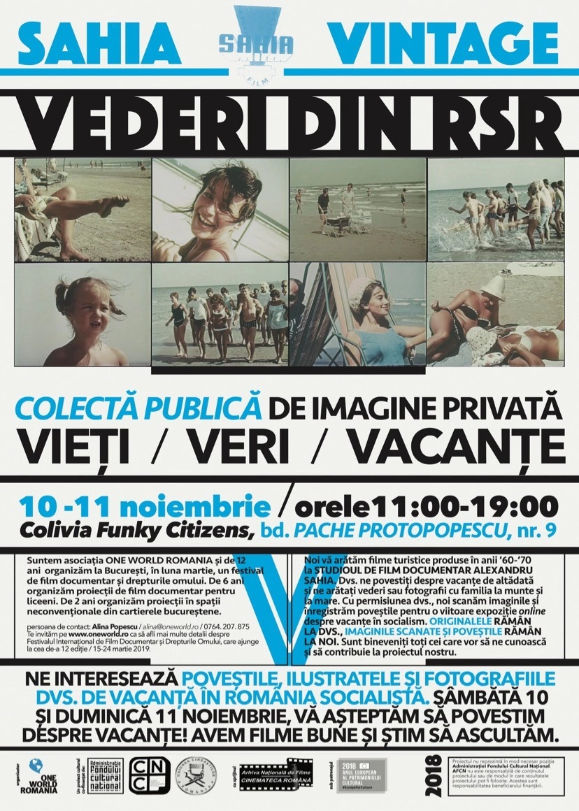 Dacă ar fi să aleg câteva lucruri care mi se par importante și relevante din cultura ultimilor 10 ani în România, unul ar fi cu siguranță proiectul Sahia Vintage, prin care Asociația One World Romania salvează de la uitare capitole importante din arhiva studioului Alexandru Sahia. Pe lângă cele câteva DVD-uri cu selecții de filme documentare lansate până acum, One World organizează constant proiecții cu diverse teme, pe care încerc cât pot să nu le ratez. Așa că programul săptămânii ăsteia e de-a dreptul un cadou: mai multe scurt metraje documentare despre cartiere bucureștene, realizate între anii 60-80, vor fi proiectate în cele cinci cartiere, în câteva licee și la Facultatea de Sociologie din București. La final de săptămână, are loc o colectă de vederi, fotografii și povești despre vacanțele din comunism, ce vor fi folosite ulterior într-o expoziție online despre vacanțele din timpul comunismului. Mai multe despre program, aici.