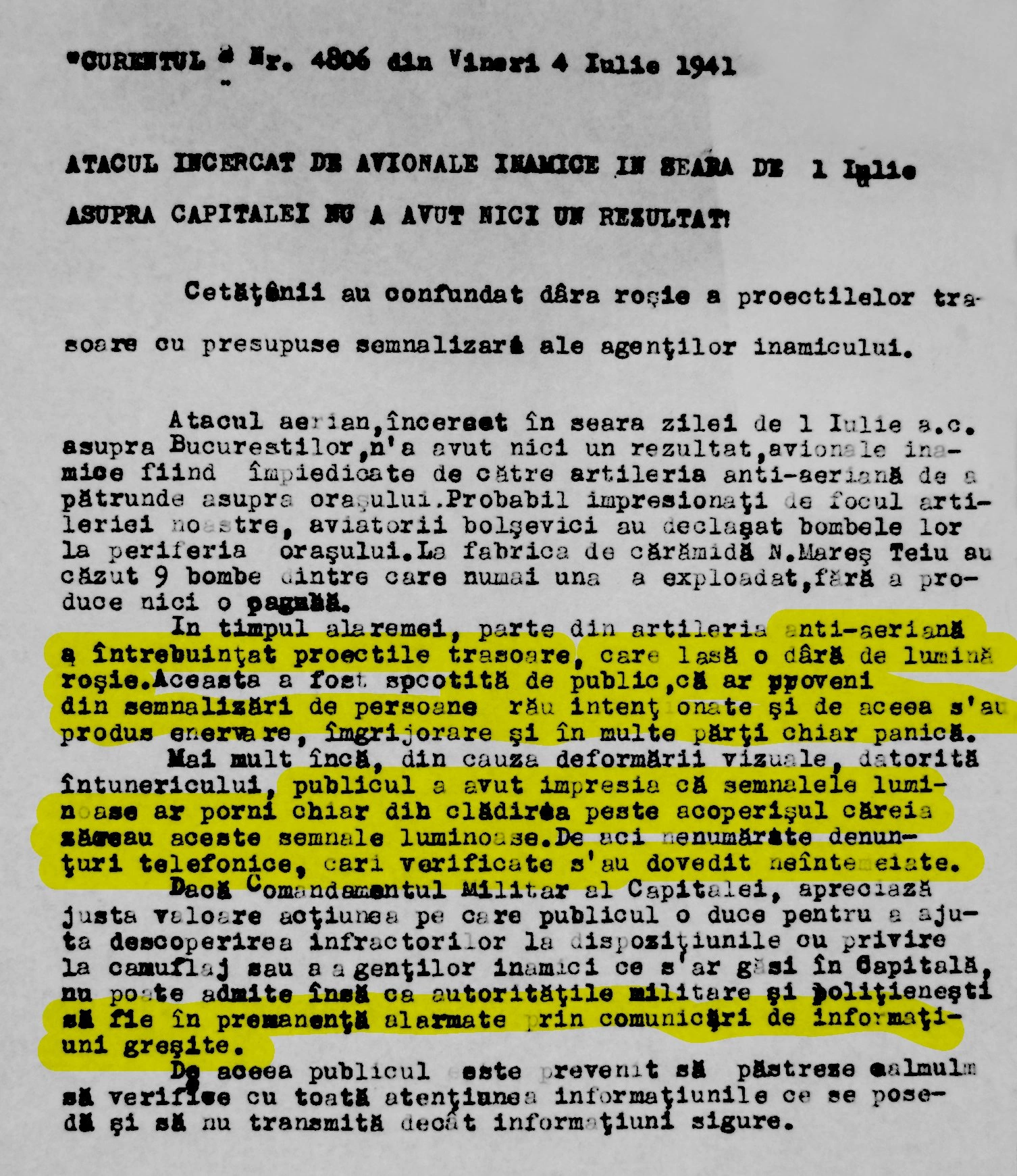 Astfel, în „Curentul”, de pildă, a apărut următorul anunț: „În timpul alarmei, parte din artileria antiaeriană a întrebuințat proiectile trasoare, care lasă o dâră de lumină roșie. Aceasta a fost socotită de public că ar proveni din semnalizările de persoane rău intenționate și de aceea s-a produs enervare, îngrijorare și, în multe părți, chiar panică. Mai multă încă, din cauza deformării vizuale, datorită întunericului, publicul a avut impresia că semnalele luminoase ar porni chiar din clădirea peste acoperișul căreia zăreau aceste semnale luminoase. De aici nenumărate denunțuri telefonice, care, verificate, s-au dovedit neîntemeiate. Dacă Comandamentul Militar al Capitalei apreciază (la) justa valoare acțiunea pe care publicul o duce pentru a ajuta descoperirea infractorilor la dispozițiunile cu privire la camuflaj sau a agenților inamici ce s-ar găsi în Capitală, nu poate admite însă ca autoritățile militare și polițienești să fie în permanență alarmate prin comunicări de informații greșite”.