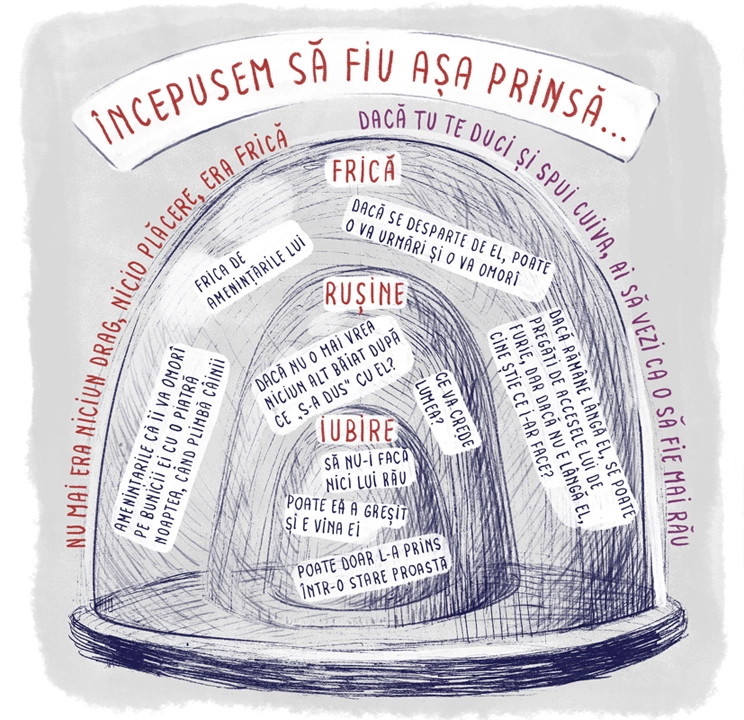 Până când am început să ne amintim momente violente din adolescența noastră pe care le uitasem complet. Prietena mea din generală a fost lovită în fața mea, iar eu nu am reacționat. Eu am fost bătută în curtea liceului cu brutalitate și nimeni nu a reacționat. Oameni din jurul nostru, de vârsta noastră, au început să se deschidă, să ne vorbească despre experiențele lor de abuz, doar pentru că auzeau că lucrăm la proiectul ăsta.