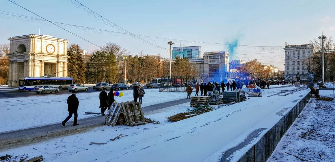 Ceva mai încolo, în aceeași piață, în dreptul arcului de Triumf și al unui banner mare, cu „Caravana de Crăciun”, se intersectează cu un grup mai numeros. Sunt circa 150 de oameni, din câte pot eu să număr, tocmai veniți de la întrunirea Partidului Liberal. Vlad Arion Nicolae (20 de ani), un moldovean blond în palton negru cu insignă tricoloră, constant înconjurat de colegii liberali care îi sorb vorbele, îmi spune că ar fi sperat și el să fie mai mulți oameni prezenți. Vremea geroasă, plus climatul politic destul de înghețat în anti-românism și el, mai ales de la alegerea socialistului Igor Dodon la președinția republicii, sunt unele dintre explicațiile posibile pentru prezența redusă. Îmi oferă discursul unionist cap-coadă, fără ezitări sau poticniri: el unul luptă pentru unire și s-a bucurat că la întrunirea liberalilor de dimineață au fost aproape 1000 de oameni. A ales să fie azi la Chișinău, mai aproape de „frații noștri”, decât să se ducă la Alba Iulia.