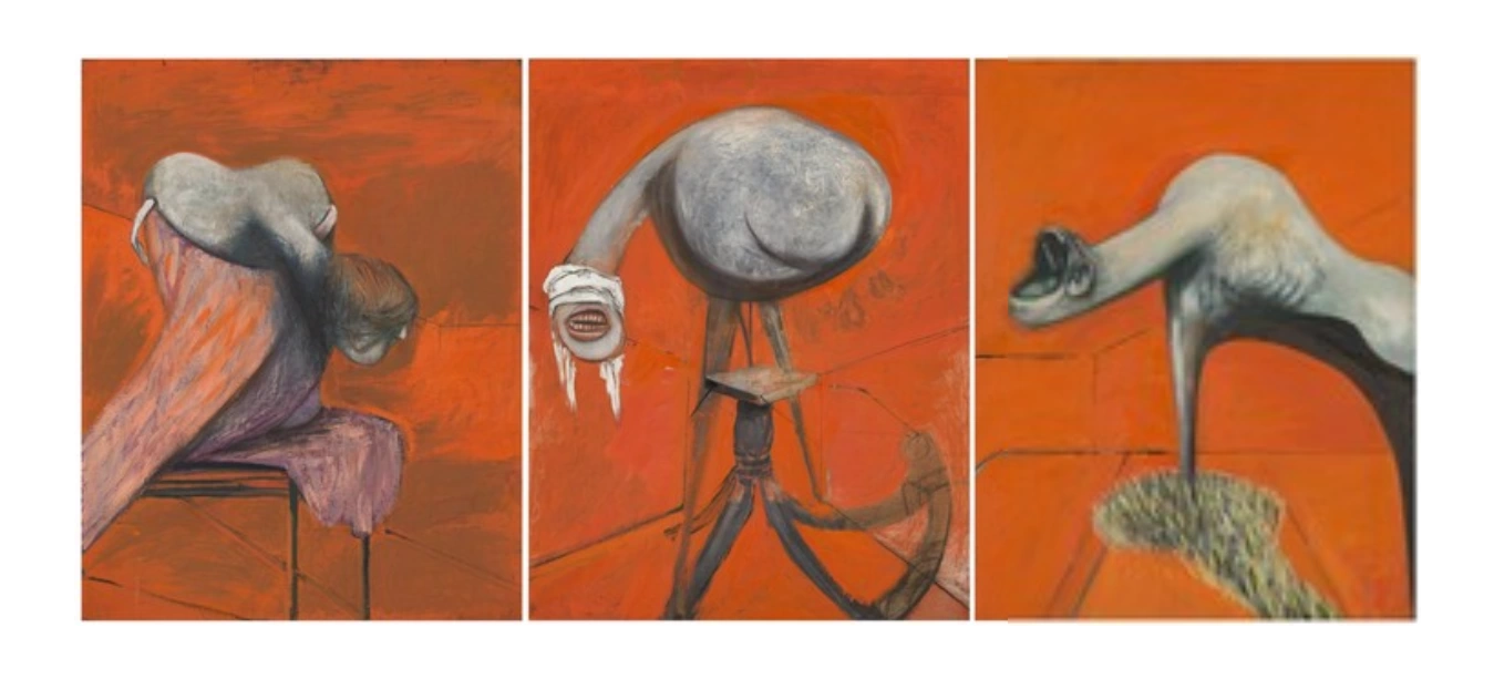 Francis Bacon se numără printre puținii pictori expresioniști din anii 60 interesați atât de pictura figurativă, cât și de corpul uman. (I-am putea adăuga aici pe Lucian Freud și pe Georg Baselitz). Felul lui specific de a structura spațiul pictural este folosirea unui cadru geometric abstract, ca un cub, desenat în jurul corpurilor umane dispuse în interiorul lui. Și tocmai acest fel de a reda spațiul real este tema acestei expoziții, despre care puteți citi mai multe aici.