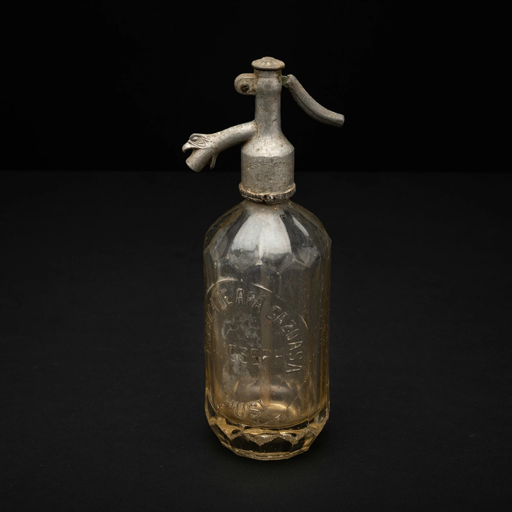 Sifonul din expoziție (produs la începutul secolului trecut, la Fabrica de Apă Gazoasă „I. Ioseph” din Huși) e rudă foarte apropiată sifoanelor pe care le-am cărat în copilărie. Pe măsură ce le-am cărat, ele au devenit din ce în ce mai ușoare, până când, în era de unică folosință, au dispărut cu totul. Mi-am început ucenicia cu sifoanele astea greoaie, din sticlă zdravănă, uneori înfășate într-o plasă de sârmă împletită (se întâmpla uneori ca sifoanele să explodeze în timpul umplerii). Proba de foc au fost anii în care ai mei făcuseră rost de un sifon uriaș, din aluminiu, meșterit clandestin într-o uzină. Încăpeau în el vreo cinci litri de apă bine pompată cu bule din mașinăria steampunk a lui nea Căpraru. În 1989 a început revoluția plasticului, iar peturile de proto-cola, pe care le-am primit toți cu entuziasm de adepți ai unui cargo cult, au înlocuit ireversibil bătrâna sticlă. Acum, singura sifonărie pe care-o mai știu e dosită într-o dugheană întunecată, de parcă acolo ar acționa un contrabandist de artefacte interzise din trecut. (Andra)