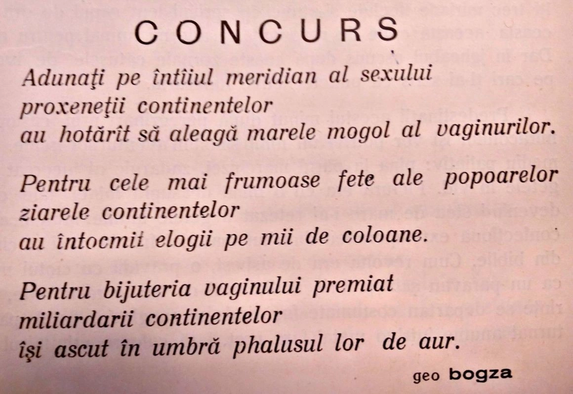 „Cu totul altfel a fost întotdeauna aspectul sexualității la Unu și în poemele mele cele mai <<imorale>>, cărora nimeni nu le va putea contesta o respirație dureroasă, un ritm al suferinței care le absolvă nu numai de penalitățile articolului 262 (n.r. - din codul Cuza, care incrimina indecența), ci și de rânjetele prostiei unanime. Violența de expresie presupune o violență de suferință, care exclude de la început prezența oricărui element pornografic, pornografia implicând în condiția ei esențială, satisfacție. Ori acolo unde e suferință nu poate fi și pornografie. Poate fi sadism mazohism sau oricare altă deprindere scelerată, dar pornografie, nu. (...)” - Geo Bogza, revista UNU, 1932.
