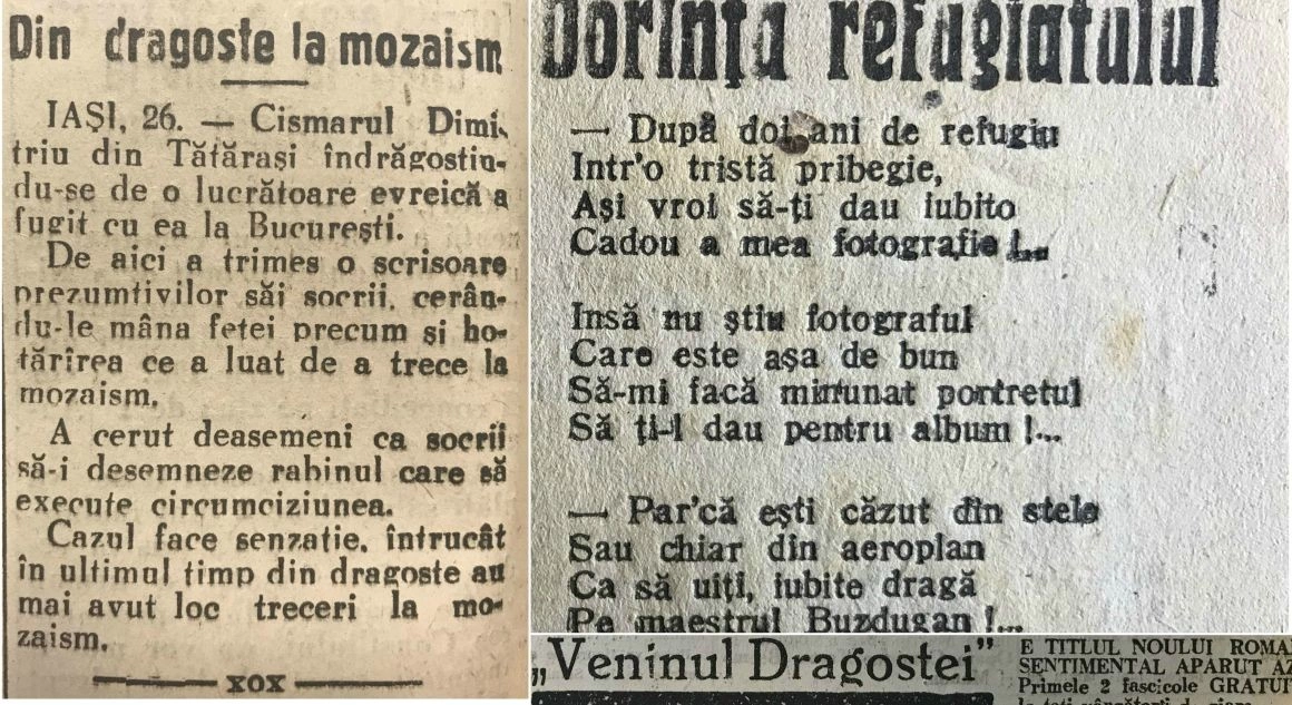 Fără nicio ambiție academică, am căutat mai întâi reprezentări ale iubirii în presa dintre războaie. Epocă în care se impun patronii de presă, când ziarele încep să câștige din publicitate, dar și din șantaje și alianțe politice. Presa era o oglindă a societății interbelice: pe de o parte - naționalism, agresivitate, misoginism (de exemplu, femeile n-au avut drept de vot până în 1938), pe de alta - pluralitate de opinii, avangardă, curaj politic. În tot acest context, „iubirea” capătă un rol important și controversat, după cum se vede în fragmentele de mai jos. Le-am selectat din publicația culturală „Rampa”, din ziarele „Curentul”, „Universul” și „Credința”, din revista avangardistă „Unu” și revista literară „Bilete de papagal”. Și le-am grupat pe câteva categorii: schițe, poezie, știri & anunțuri, texte de opinie.