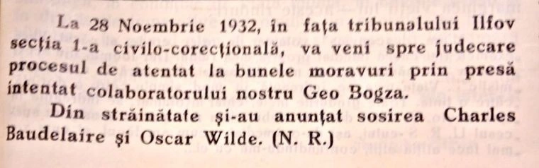 Geo Bogza ajunge în fața instanței pentru că a atentat la bunele moravuri într-un articol de presă. Poetul este achitat în noiembrie 1932.