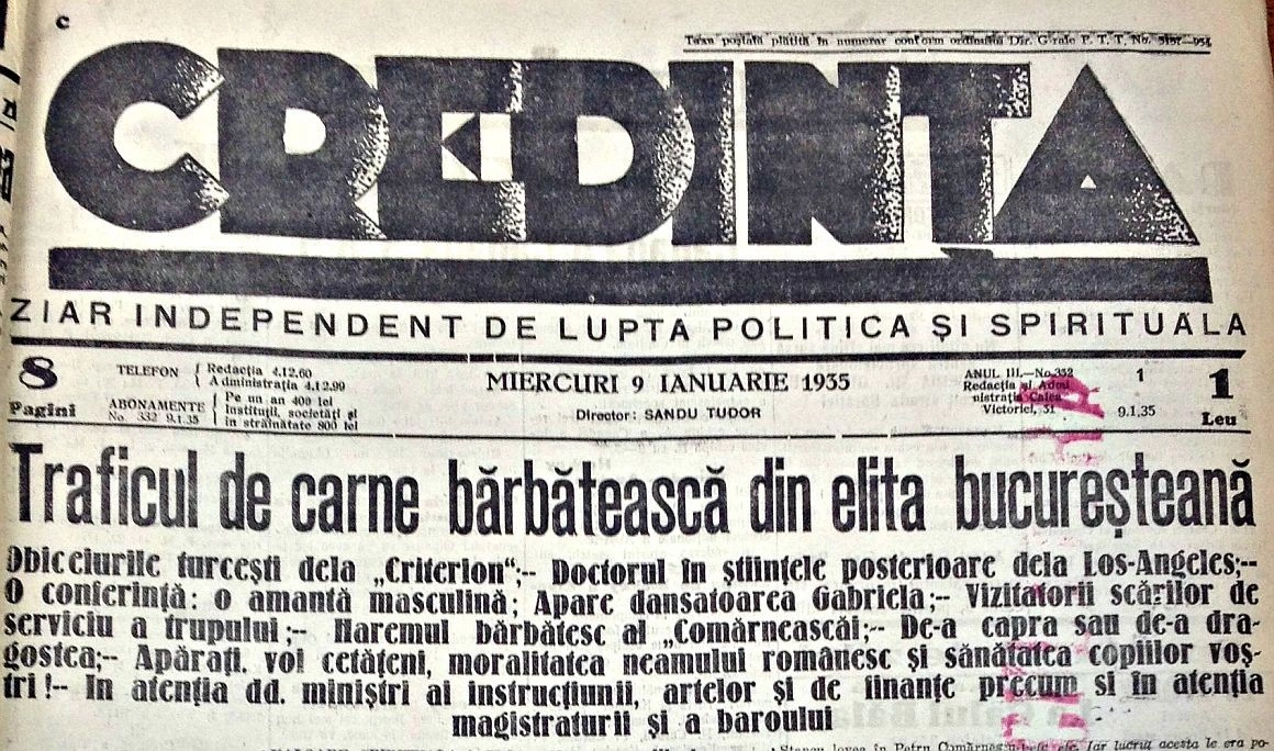 Sandu Tudor, directorul ziarului „Credința”, duce o campanie homofobă și scrie despre „traficul de carne bărbătească din elita bucureșteană”. Se referă la grupul Criterion, din care făceau parte unii dintre cei mai populari intelectuali interbelici. Aceștia dau ziarul în judecată pentru calomnie.