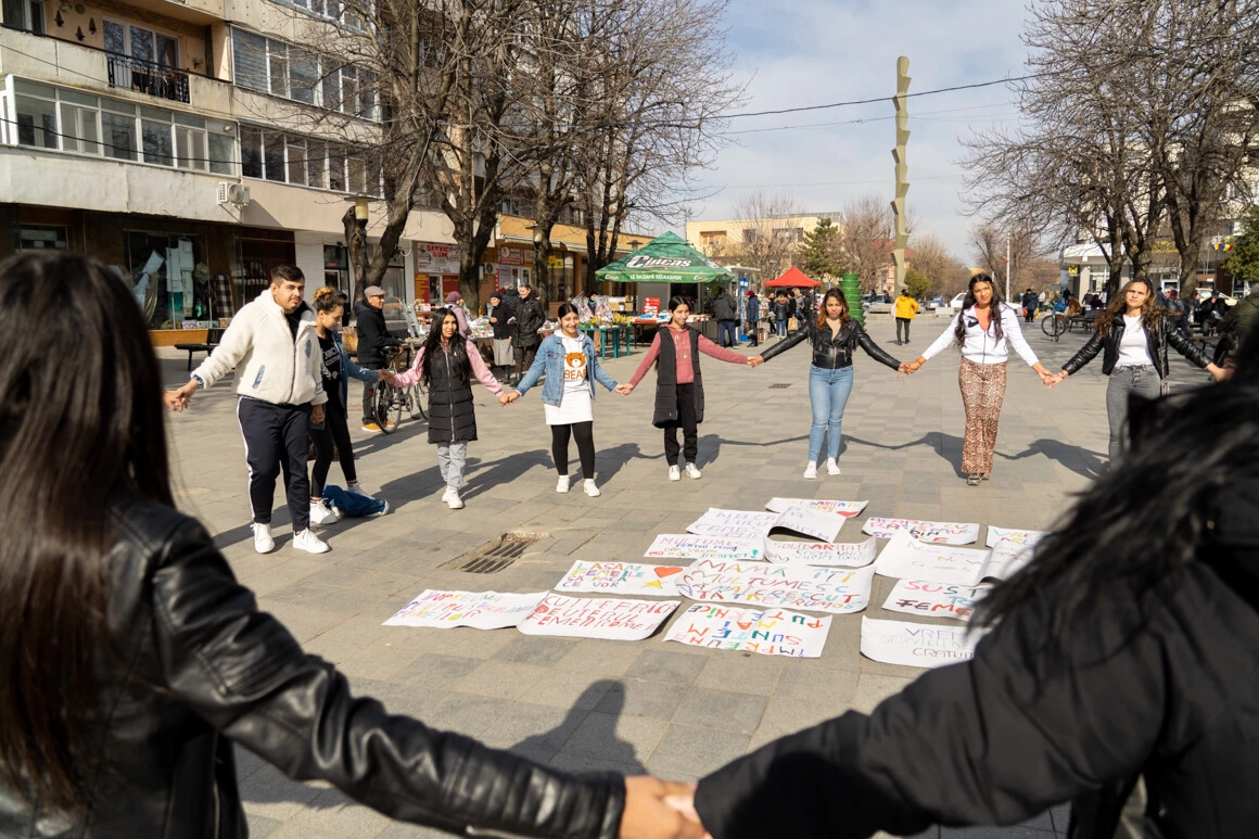 Nu e nici pentru tineri prima activitate a zilei. Dimineață, adolescentele au organizat un flashmob în centrul orașului cu pancarte care să atragă atenția că 8 martie e mai mult decât o ocazie de oferit flori. Au afișat mesaje precum: „Mama, mulțumesc că m-ai crescut așa frumos.” „Corpul nostru nu este obiectul vostru”, „Mulțumesc pentru flori, dar vreau respect”. Au venit pentru că cred că e important să fie vizibile și să-și ceară drepturile, pentru că deja s-au întâlnit cu discriminarea. Când au mers în spital cu mamele lor și au văzut că ele nu sunt tratate la fel ca româncele, când au intrat în instituții publice și au auzit „iar au venit ț*ganii cu noroi”, când au fost controlate „aleatoriu” în hipermarket. La școală, unde profesorii vorbesc mai frumos cu băieții români, pe care îi dau mereu ca exemplu, chiar dacă au aceleași note ca ele.