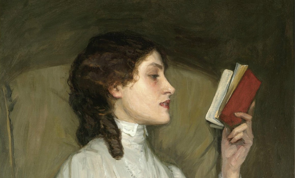 Imagine principală: detaliu din Sir John Lavery, „Miss Auras, The Red Book”