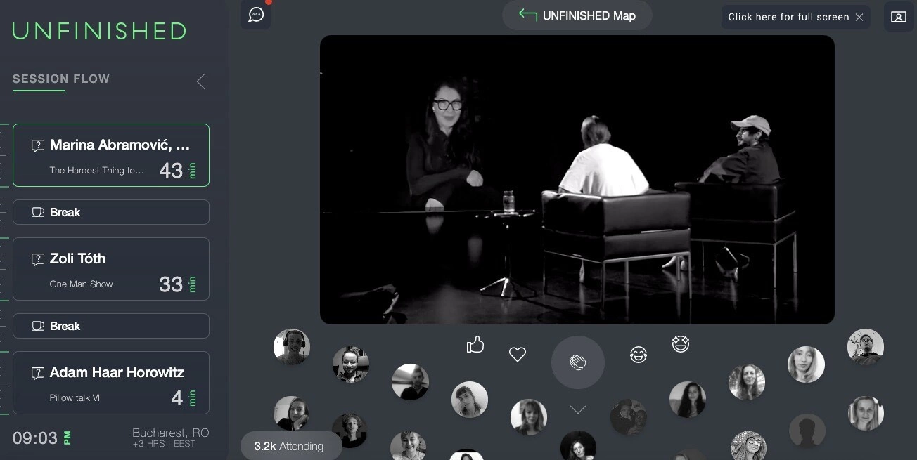 Weekendul ăsta, am urmărit-o de pe ecranul calculatorului pe Abramović, care în noiembrie împlinește 74 de ani, în dialog cu Capucine Gros, artistă de origine elvețiană stabilită în România, și cu directorului festivalului Unfinished, Cristian Movilă.