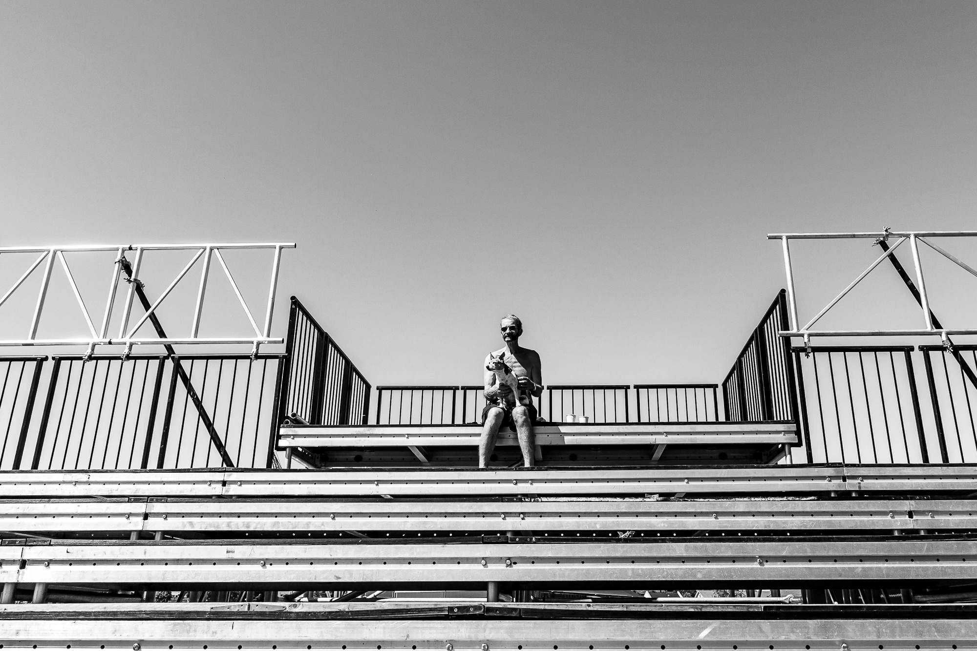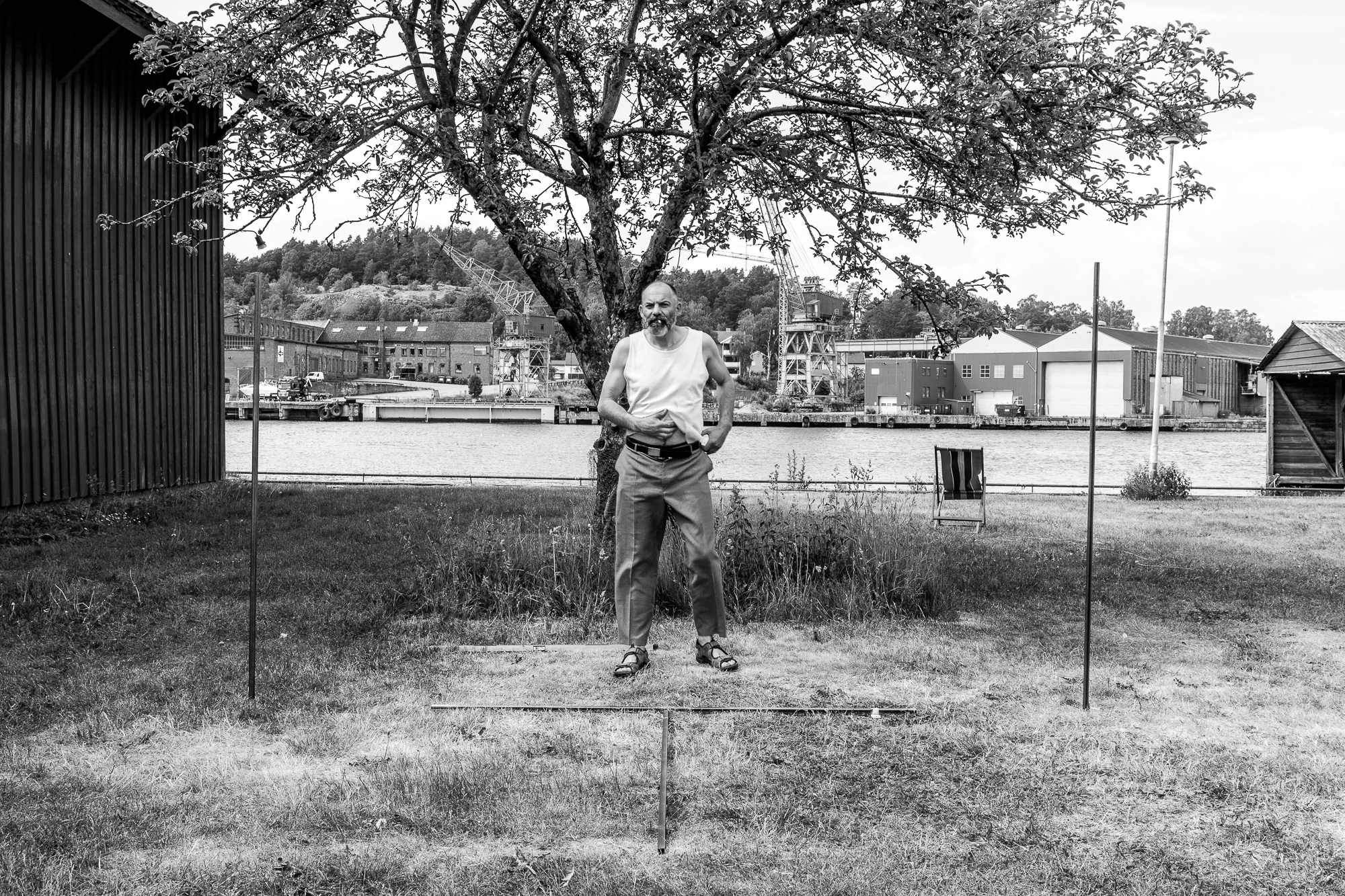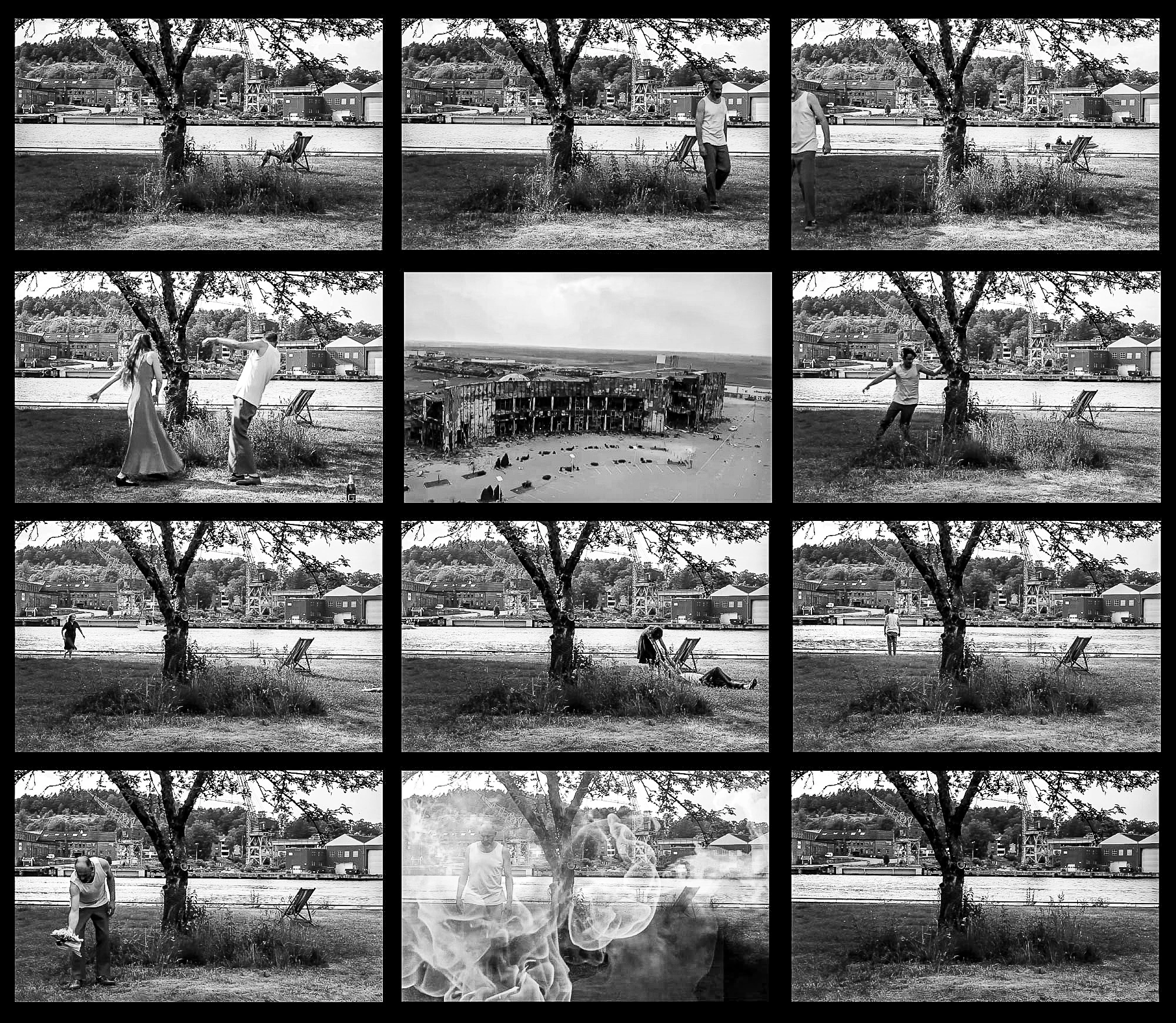 Am hotărât rapid locul unde aveau să se întâmple toate acestea: o peluză de pe malul râului. Peisajul industrial al acestei zone din oraș este întrerupt de liniștea dată de coroana regulată a unui copac. Cu ajutorul unor bare metalice am decupat o parte din acest peisaj. Personajul pendulează între două realități. Interiorul dreptunghiului rezultat este una dintre acestea, lumea perfectă. Raportul laturilor dreptunghiului se apropie de proporția de aur, la fel și poziția copacului față de latura de jos a formei geometrice care îl încadrează. Trebuie să fie ceva cu ecranele astea, de stăm și privim în ele cât e ziua de lungă, nu?