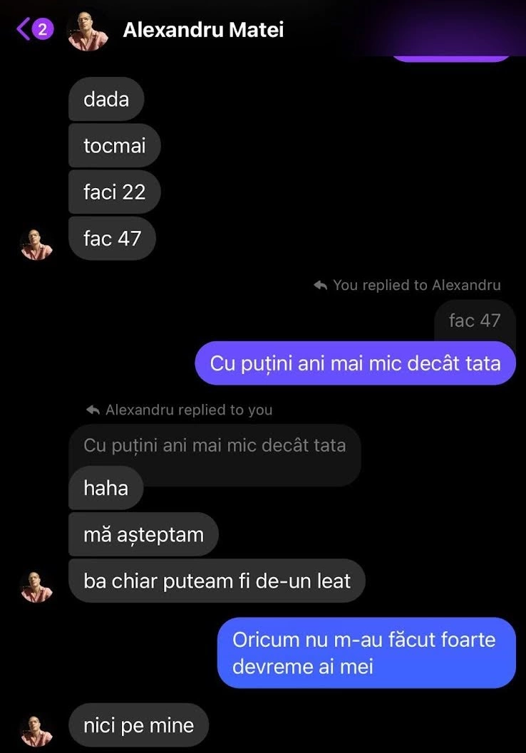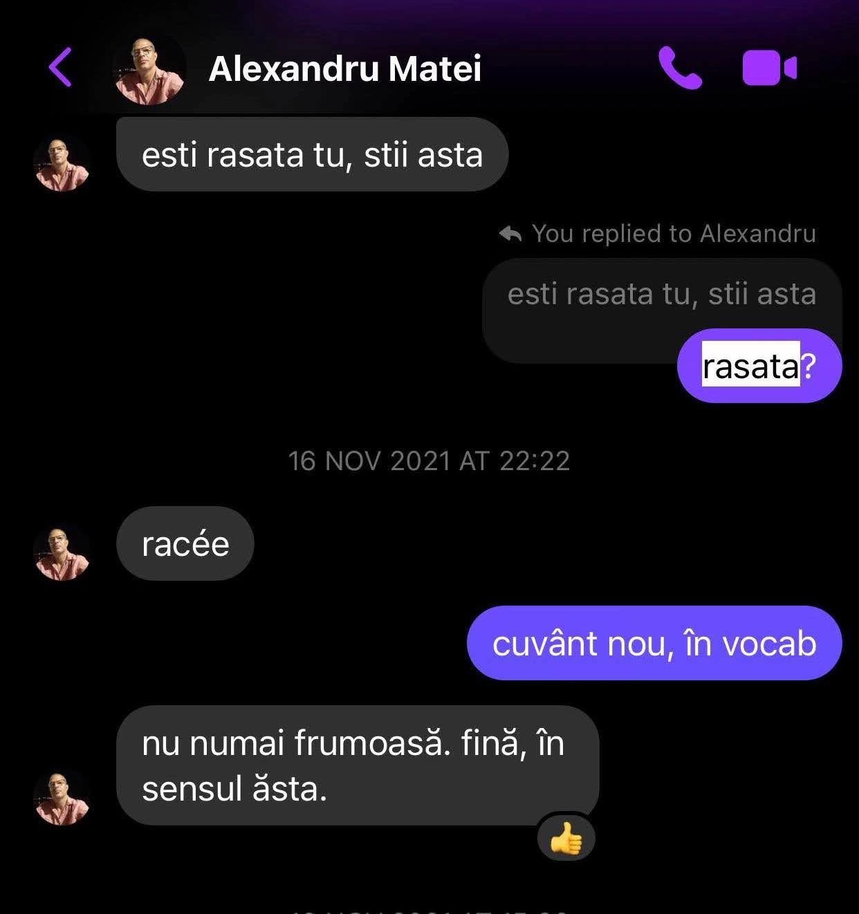 „N-am spus că e bine că s-a întâmplat o astfel de discuție între mine și acea fată. Dar discuția aceea conține și alte schimburi decât cele pe care le-ați văzut pe Facebook.”, a declarat Matei.