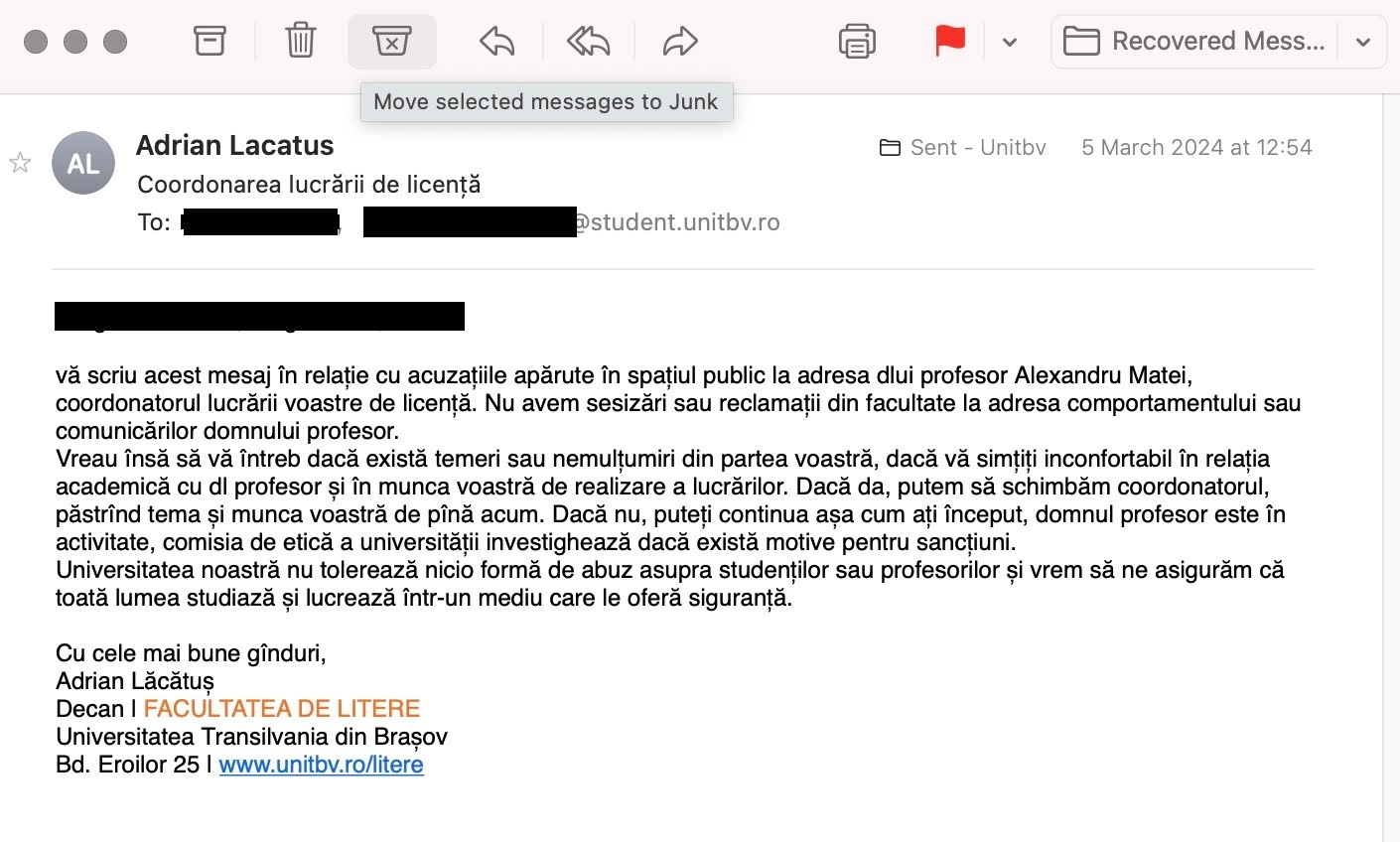 „Comunicarea lui Alexandru Matei cu diverse persoane, fie ele persoane din afara facultății sau studente, este o comunicare nepotrivită și nejustificată în termeni instituționali și profesionali”, ne-a explicat decanul Facultății de Litere din Brașov, criticul literar Adrian Lăcătuș, într-un interviu telefonic.