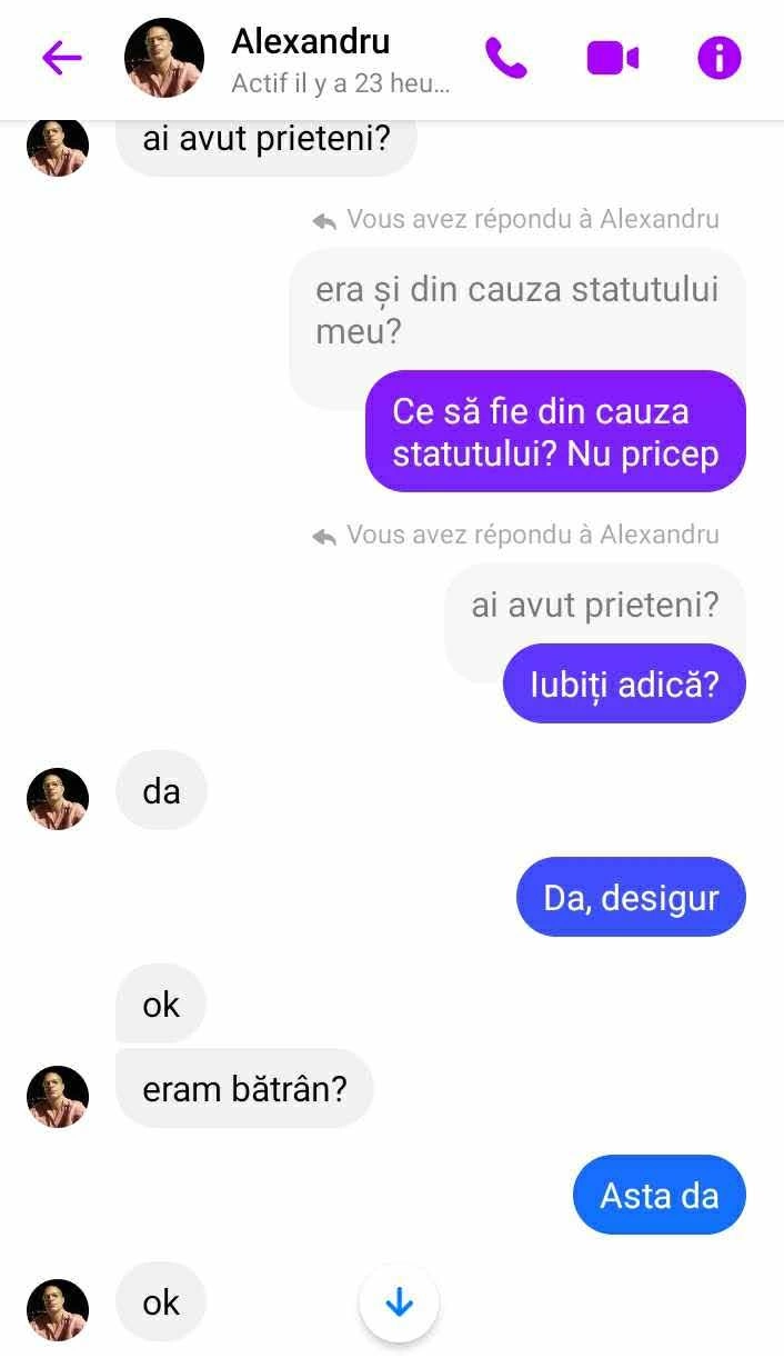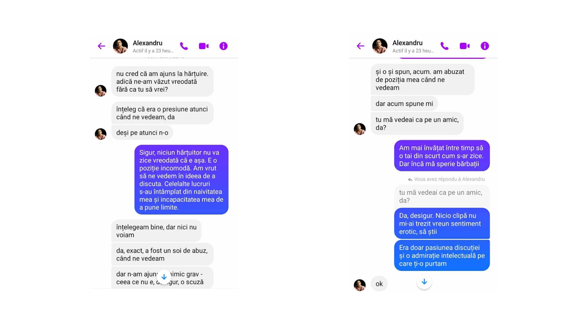 S-a înfuriat atunci, povestește, dar a reușit să-l confrunte în legătură cu lucrurile astea abia mai târziu, prin 2018, când Alexandru Matei i-a scris din nou pe Facebook. Deniz a simțit că era momentul să-i spună că nu a fost în regulă să-i scrie surorii ei. „Am văzut o singură replică adresată surorii tale. Iartă-mă dacă am fost agresiv”, i-a răspuns Matei.
