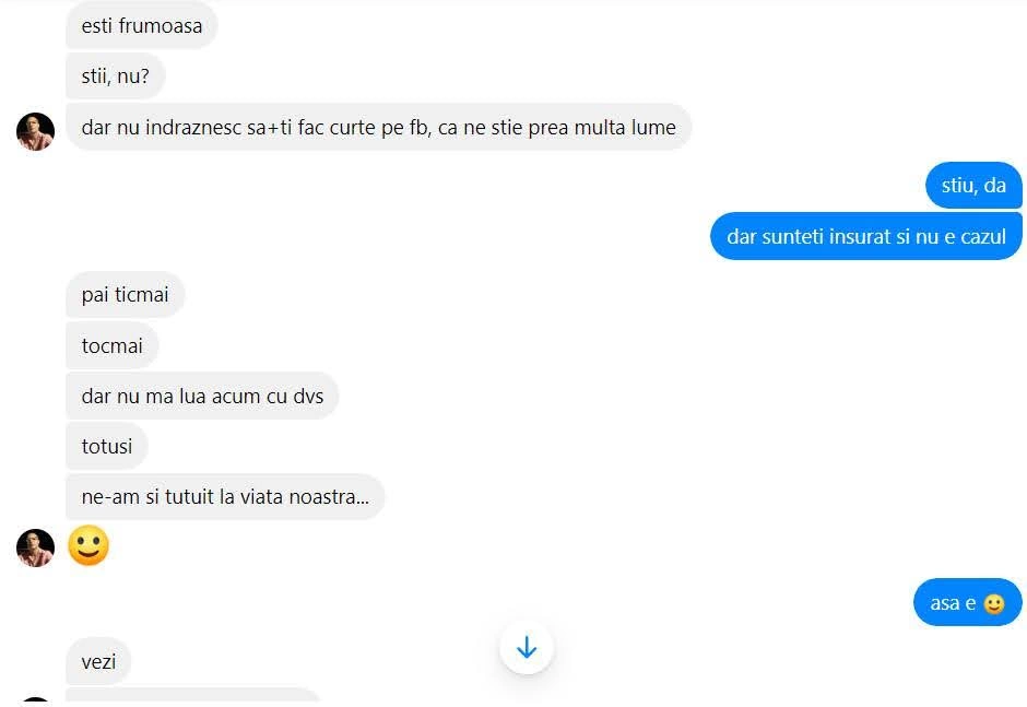 „Ești frumoasă. Știi, nu? Dar nu îndrăznesc să-ți fac curte pe fb, că ne știe prea multă lume”, este unul dintre mesajele pe care i le-a trimis adolescentei la acea vreme. „Gândește-te dacă ai avea o fată de 17 ani. Ți-ai dori să aibă afaceri cu un prof de 30 și foarte însurat?”, i-a tăiat-o atunci Cătălina.