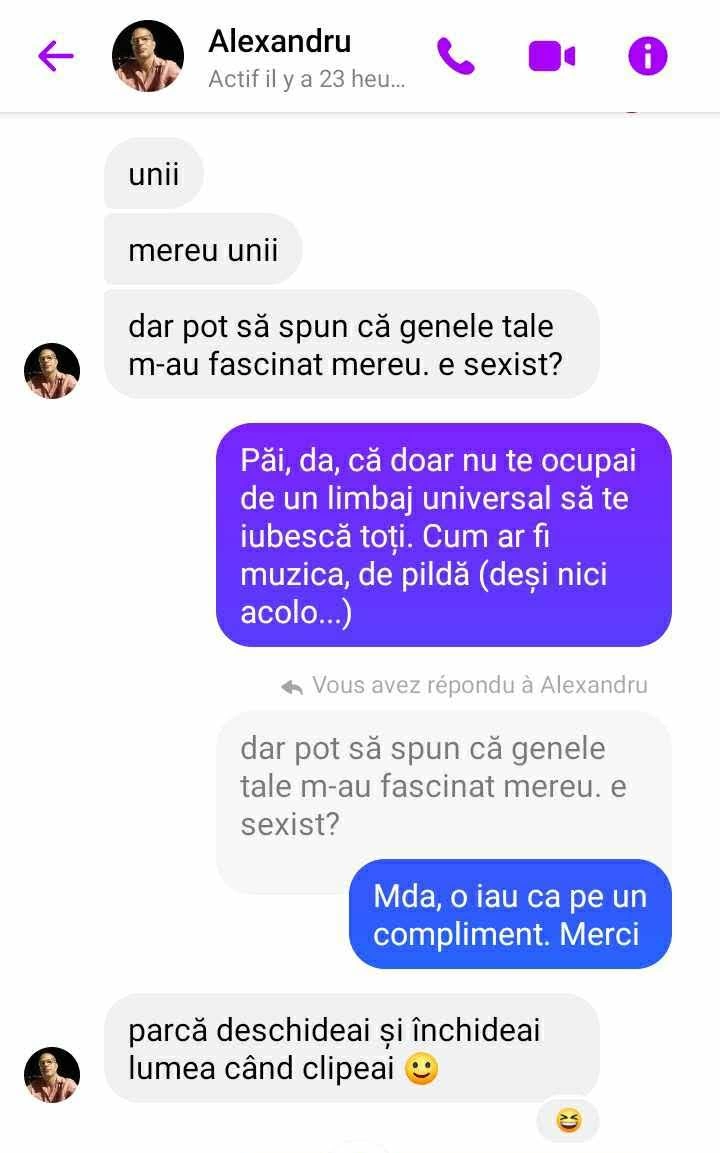 „E clar că e ceva aici, și e mișto, nici nu ne-am văzut”, „Se vede că te controlezi”, „Sunt curios să te cunosc” sau „Ești adorabilă” sunt câteva dintre mesajele pe care le-a primit de la Matei.