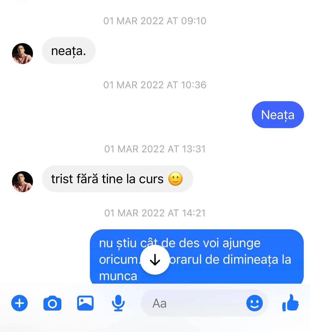 Daria* nu a simțit că ar fi putut să vorbească despre mesajele pe care i le trimitea Matei cu colegii ei sau cu vreun alt profesor. Singura căreia i-a povestit a fost colega ei de apartament de la acea vreme, Otilia*.