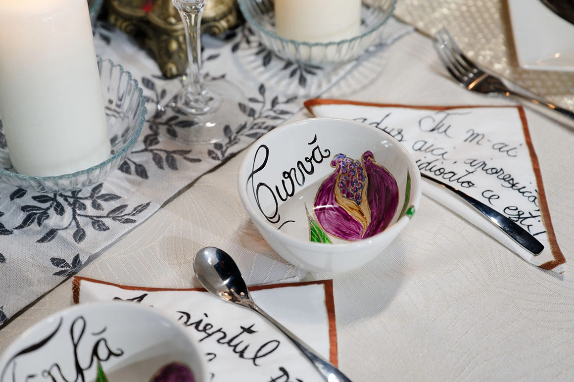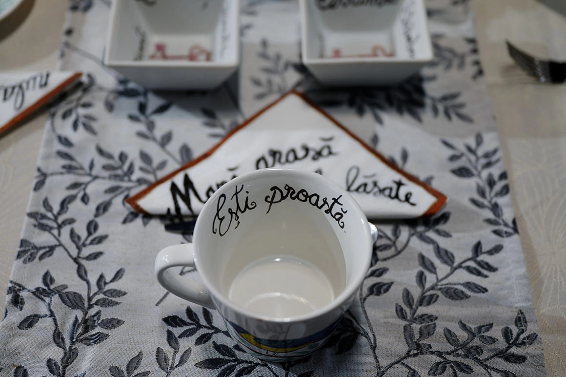 După ce încep să mă dezvăț de frică, în inima mea încolțește o idee. O să iau o parte din expresiile oribile pe care mi le-a adresat fostul meu partener și o să le pun pe porțelan. O să fac o colecție de o frumusețe schizoidă. Bag la cuptor prima cană cu farfurie. Încep să mă gândesc că poate ar trebui să adun mesaje de la mai multe femei care au trecut prin aceleași experiențe. Încet, încet, adun mesaje de la peste 50 de femei. Cuvintele sunt foarte greu de dus. Un obiect care în mod normal îmi ia o zi să-l pictez, îmi ia acum săptămâni. Aleg doar o parte dintre expresii, pentru că multe se repetă.