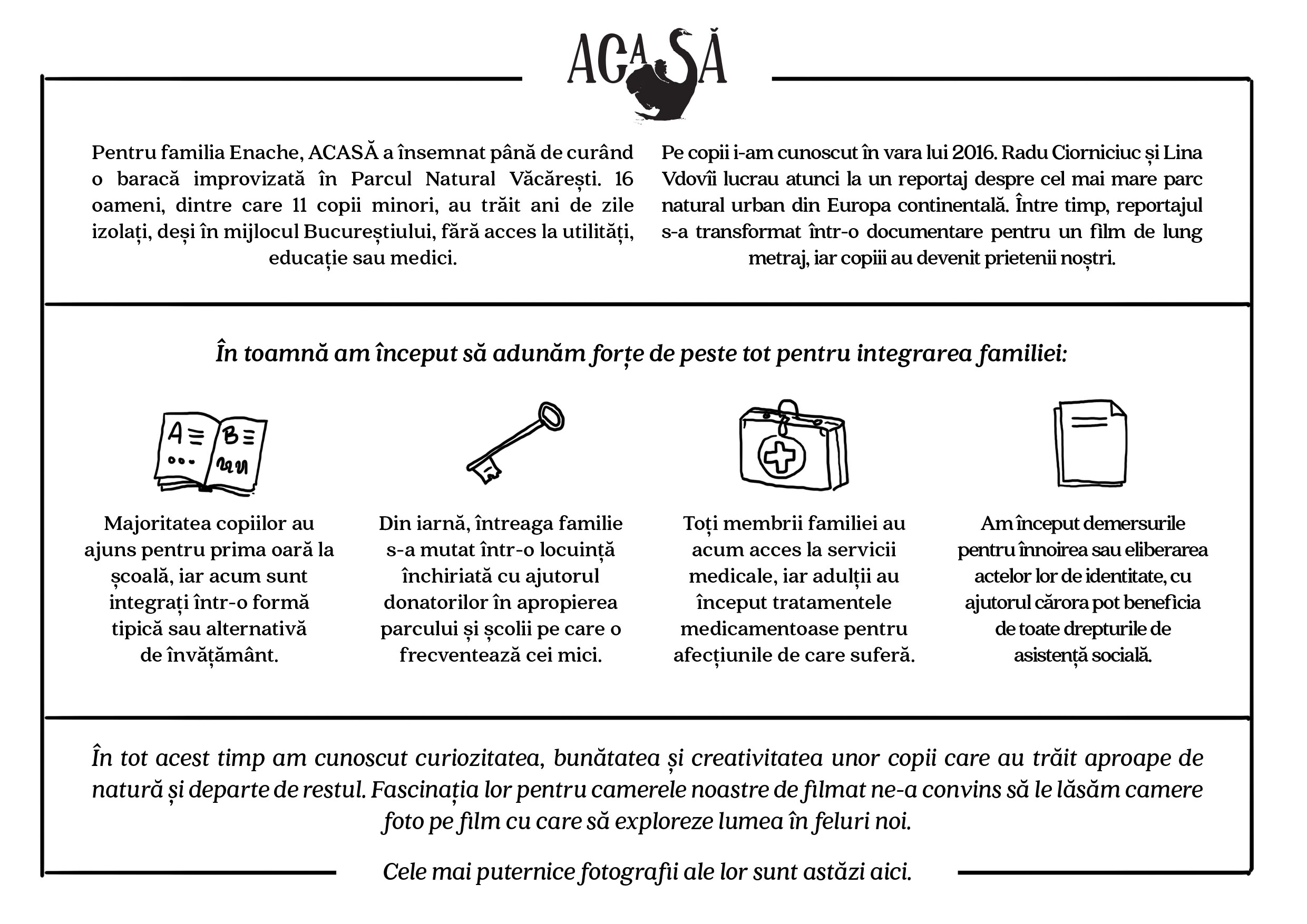 Reportajul nostru s-a transformat încet-încet într-o documentare pentru un film de lungmetraj despre identitate, apartenență - iar „Acasă” a devenit titlul documentării noastre. Și, pentru că băieții și fetele din familia Enache au fost atât de generoși și ne-au primit în viețile lor - după multe dezbateri despre etică și despre cum jurnalistul nu are voie să se implice în viața subiecților lui -, am decis vara trecută să-i ducem pe copii la școală. Să-i ajutăm să învețe să scrie și să citească.