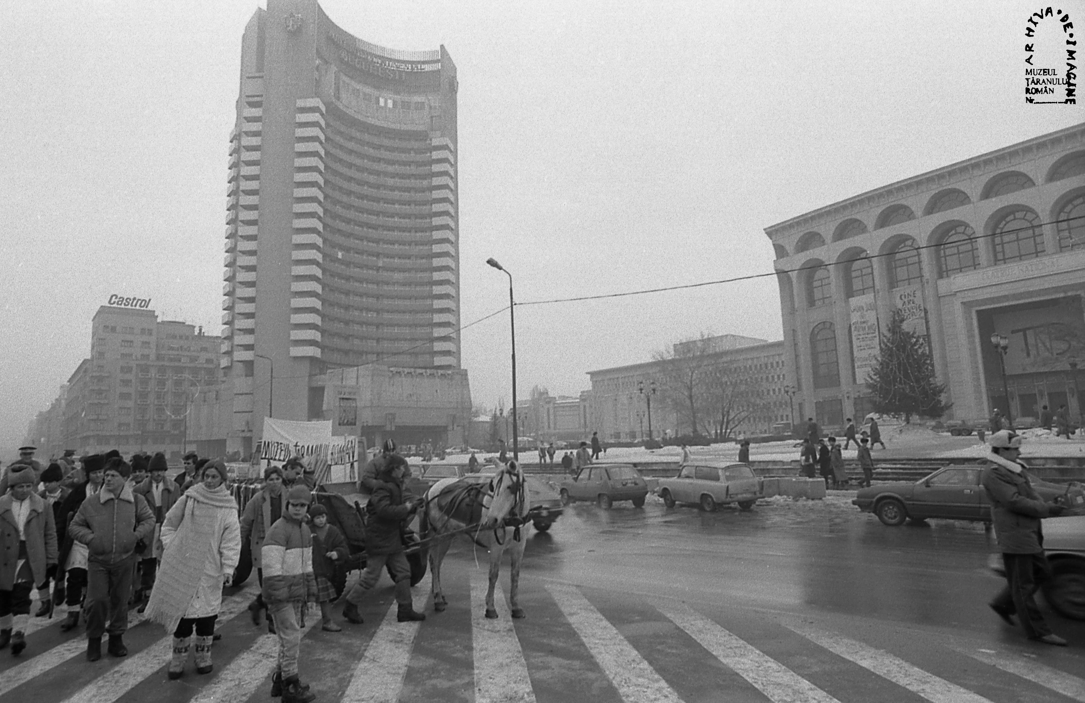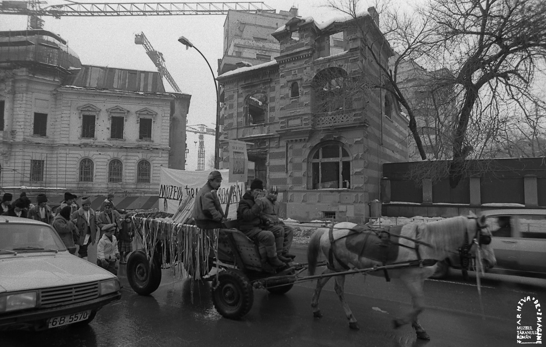 Prima oară am ieșit în stradă cu Foaia de Crăciun. Asta a fost într-adevăr cu totul neașteptat, pentru că am ieșit cu o căruță, cu un cal amărât adus din apropiere, cu niște colindători excepționali din Slobozia, descoperiți de etnomuzicologii noștri, de Speranța Rădulescu în primul rând. Cântau cu totul altfel decât te-ai aștepta să fie cântate colindele: gros, ca un regiment de bătrâni. Melodia era ritmată lent, trâgând de buhai și bătând din tobe. Pentru bucureștean, asta nu însemna colind. Un coleg de-al nostru, Gabriel Hanganu avea căruța plină de aceste foi lucrate tot de noi manual, făcute sul și legate cu sforicele, pe care le împărțeam lumii pe stradă. În spate erau acești bărbați care cântau relativ trist și băteau din tobe, după care venea alaiul nostru, cei ai muzeului, care eram oarecum stânjeniți pentru că ieșeam prima oară în stradă și umblam așa, destul de strânși unii în alții, în spatele căruței. Lumea care trecea era convinsă că e o înmormântare: mașinile claxonau, aprindeau farurile și noi mergeam cu „înmormântarea” noastră tot înainte. Pe urmă, când ne-am dat seama, am început să ne amuzăm, să râdem, și lucrurile s-au schimbat puțin.