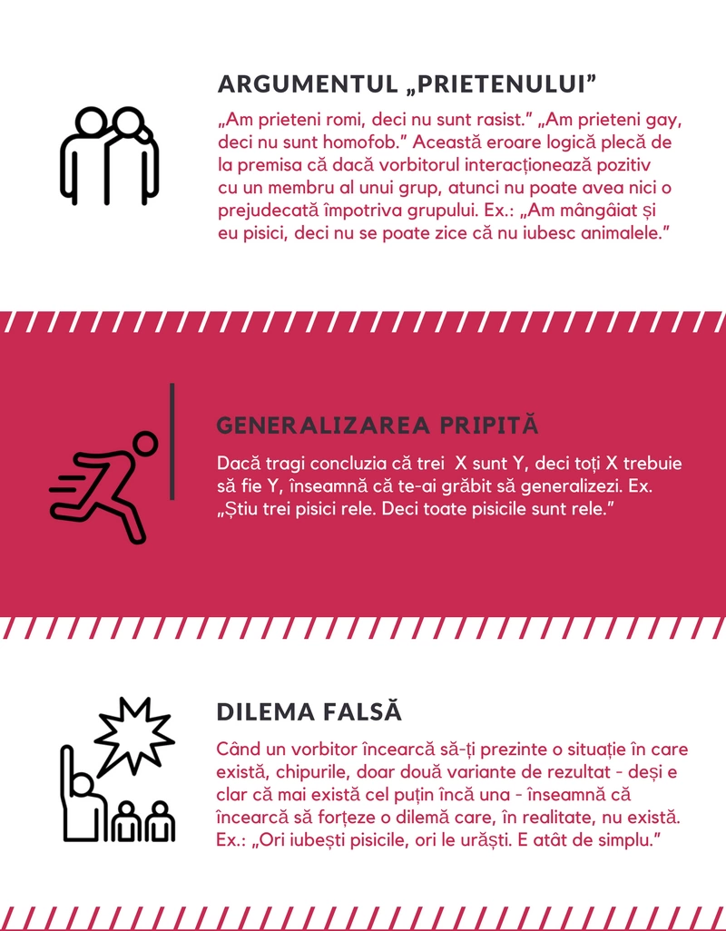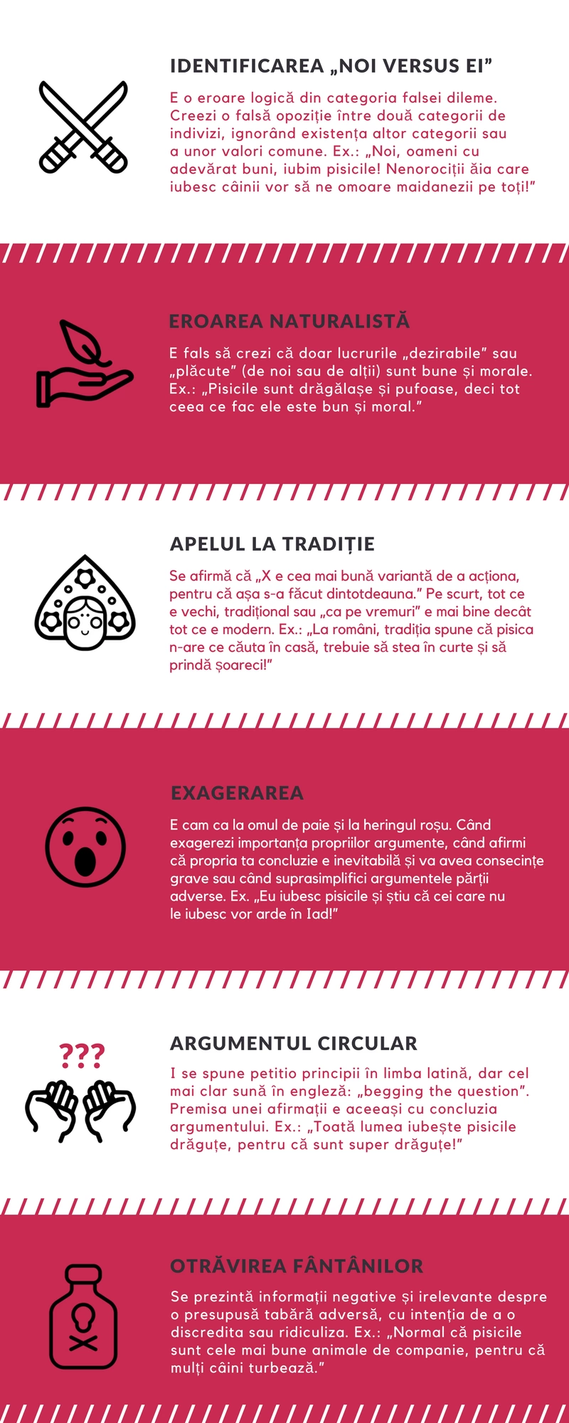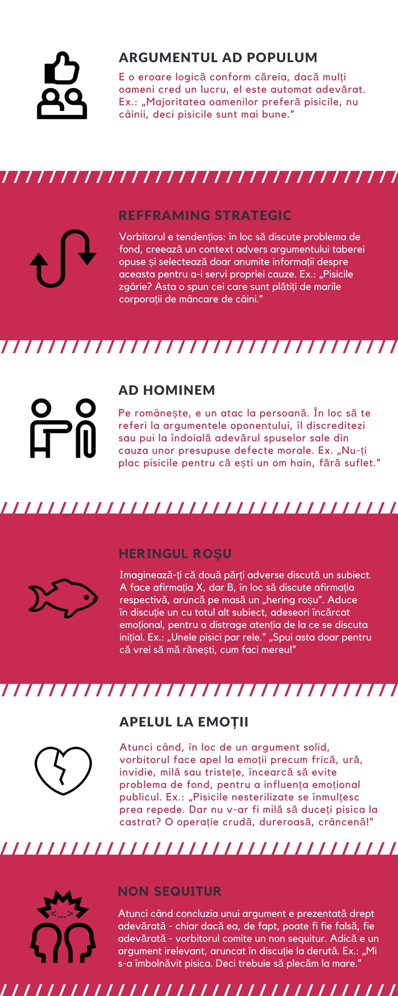 Cu ajutorul lor, am pus cap la cap legenda de mai jos: un infografic care să te ajute să înțelegi și să identifici erorile logice de tip „om de paie”, „hering roșu”, „pantă alunecoasă” și multe altele. Nu sunt singurele strategii la care au apelat vorbitorii de la conferință, ci doar cele mai evidente.