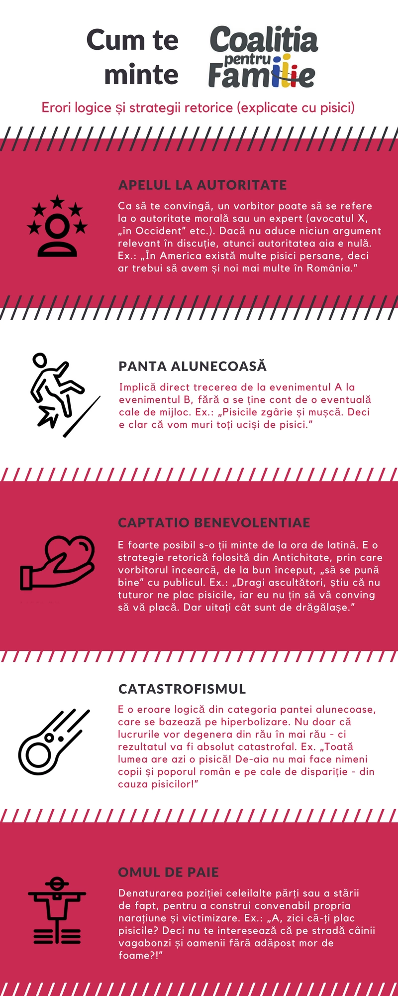 *Factuale, logice, de argumentare, retorice etc. Începem cu neadevărurile factuale, care sunt fie informații false, fie incomplete sau distorsionate în așa fel încât să pară adevărate și înfricoșătoare. Prima parte e cea de fact-checking, iar apoi trecem la chestii mai sofisticate: cum își construiește Coaliția pentru Familie discursul fricii și apelul la război.