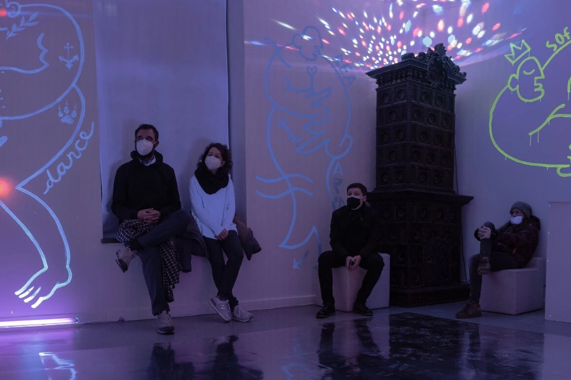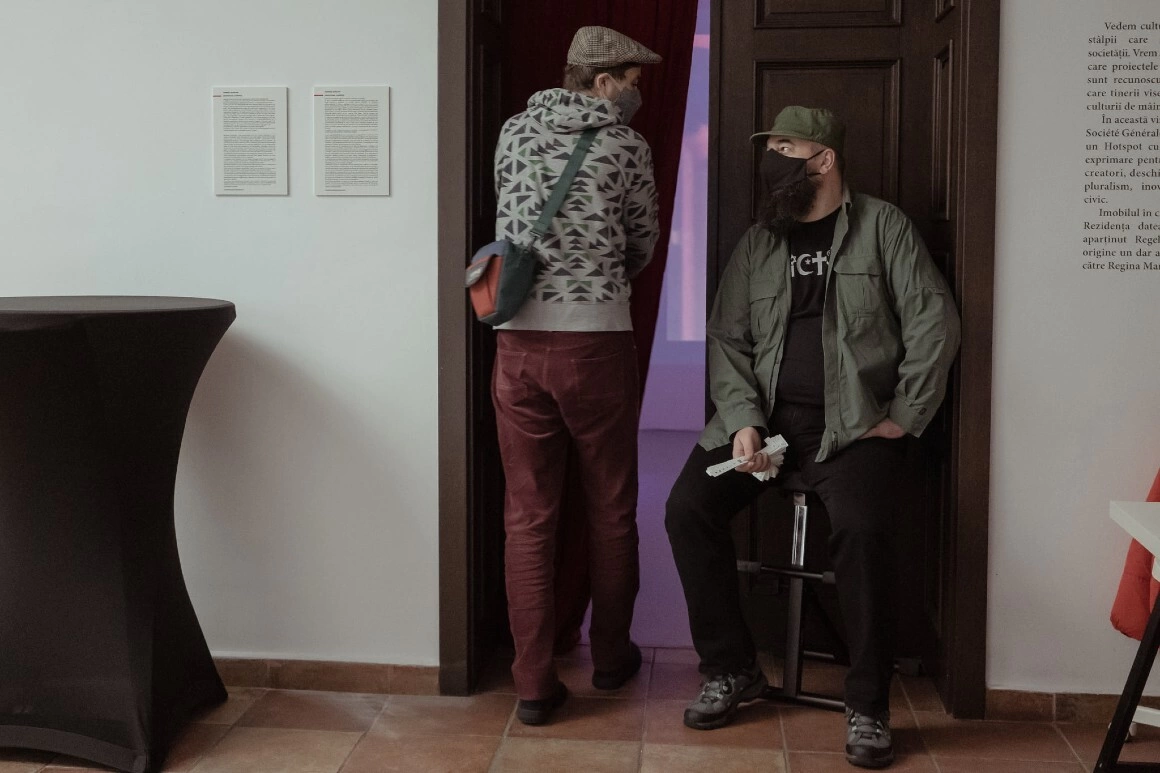 Cristiana Chivu aka Lună a făcut o treabă excelentă cu desenele murale, Suzana Dan a aranjat podeaua reflectorizantă, Irina Trocan și Marian Codrea au încins atmosfera cu luminile pe sobă, Tiberius bouncer-ul de vernisaj intra după oameni să le pună brățara AICI.ACUM la mână și tot așa...