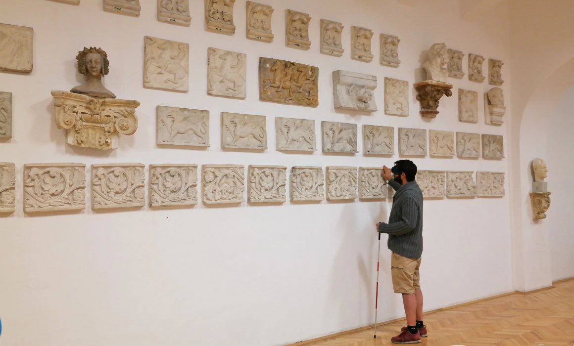 Eu mi-am pus ochelarii în fața unor trepte, pe care a trebuit să le urc cu ajutorul bastonului. Din fericire, înainte de a începe explorarea, Alex, ghidul nostru nevăzător, ne-a explicat cum ar trebui să ne orientăm în spațiu și cum să folosim bastoanele. Deși văzusem scările înainte de a-mi pune ochelarii, pe tot parcursul urcării lor am avut o constantă senzație că voi cădea. Odată ajunsă sus, în camera expoziției, lucrurile au decurs ceva mai ușor. O voce m-a ghidat către exponate, iar eu le-am atins și mângâiat, tot încercând să-mi dau seama ce reprezintă. Nu am dibuit-o decât pe Venus, zeița frumuseții, deși Alex mi-a povestit care ar fi cea mai bună metodă de explorare tactilă a lucrărilor. Am avut senzația că am trecut prin mai multe camere, că voi dărâma în mod sigur vreun exponat sau că mă voi împiedica, iar singurul moment de siguranță a fost când am întâlnit alte mâini care bâjbâiau și ele în căutarea a sensului.