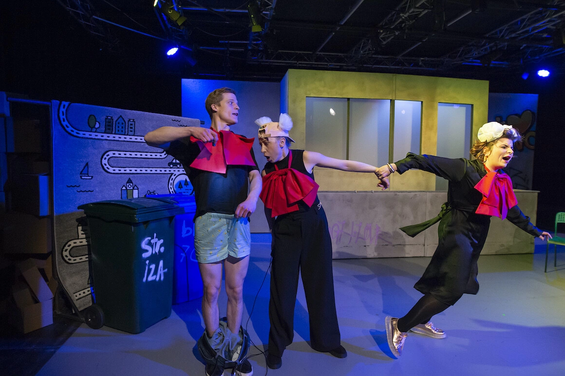 Eduard Trifa / Valentin lucrează cu un comic în stilul lui Buster Keaton, o figură serioasă, aproape imobilă, afișând uneori o stânjeneală față de confesiuni, de unde se vede că și-a însușit bine principiile vieții de cartier. Ruxandra Maniu / Iovana acoperă cu volubilitatea și expansiunea ei câteva cicatrici emoționale. Anda Saltelechi / Carmen pendulează abil între comedie pentru vârsta copilăriei și dramă la maturitate, amplificând în timp frustrările din adolescență. Vlad Bîrzanu / Denis excelează într-un număr mare de personaje de vârste și din timpuri diferite, extrem de fluid în a trece dintr-un registru în altul cu instrumente teatrale variate.