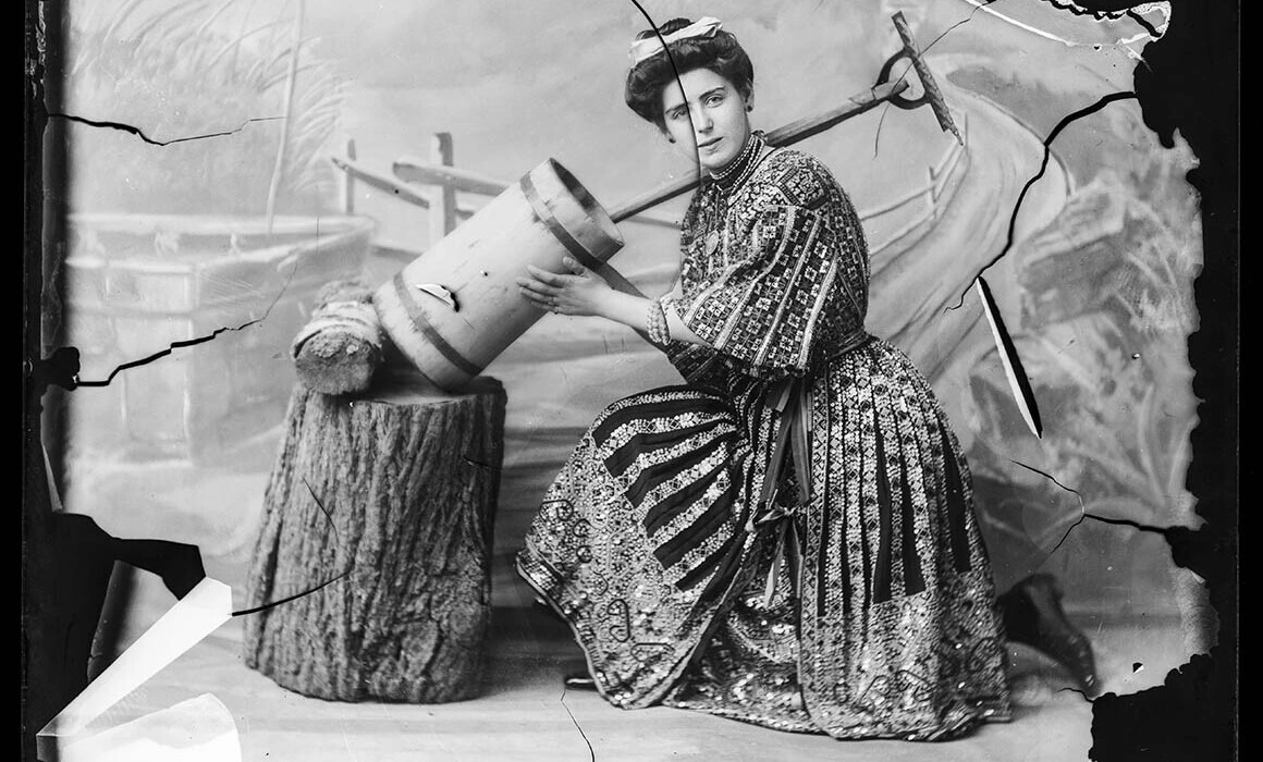 O altă tensiune prezentă în imaginile expuse este cea dintre un naționalism asumat și viziuni ceva mai moderne ale reprezentării genului. O găsim în cadrul grupajului de portrete, cu imagini din prima jumătate a secolului XX, dar și câteva reprezentări de secol XIX. Subiecții apar reprezentați în tot soiul de contexte, de la țărani și țărănci în port național, la familii burgheze. Fiind vorba în mare parte despre fotografii de studio, costumele, posturile și recuzita sunt atent coregrafiate și vorbesc despre statutul celor portretizați. Cu puține excepții, lumea femeilor este clar delimitată de cea a bărbaților, mai ales în portretele de familie, unde femeile apar în apropierea copiilor, iar figura masculină este cea dominantă. Nu pot să nu remarc stereotipuri încă actuale, în care femininul este asociat cu grija, delicatețea, supunerea și familia, în timp ce masculinul reprezintă acțiunea, decizia, puterea și intelectul. Pe scurt, o Românie aflată în plin patriarhat tradițional. La sfârșitul secolului al XIX-lea și pentru o bună parte a secolului XX, munca nu le făcea independente pe femei, iar căsătoria era văzută ca un aspect necesar supraviețuirii lor. Unele fete nu aveau acces nici măcar la un mariaj impus în absența dotei, o mică avere ce intra tot în administrarea soțului după căsătorie. În acest sens, mi-au atras atenția o serie de fotografii cu miri și mirese înrămate chiar de Oroveanu folosind rame colecționate de el. Scormonind prin albumele de familie, găsești imagini asemănătoare, ceea ce mă face să mă gândesc cum repertoriul genului se construiește în memoria colectivă printr-un imaginar fotografic din care fiecare deținem propriile fragmente.
