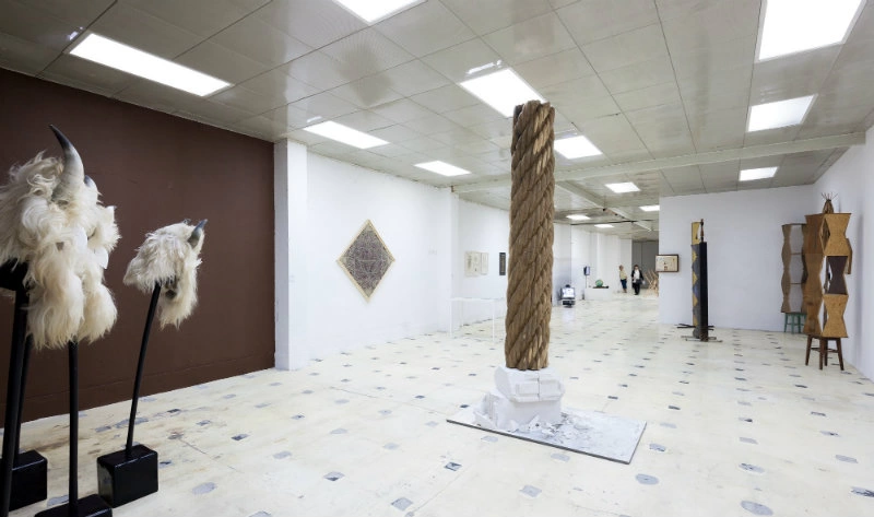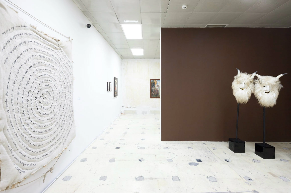 Strategia curatorului Wim Waelput e de a marca niște puncte exagerate ale acestei discuții, creând astfel o serie de contraste puternice. Filosofic, am putea spune că expunerea funcționează într-o perfectă schemă dualistă, construind opoziții binare. Pentru început, binele și răul. În dreapta, Ioana Nemeș cu niște măști populare, în stânga Victoria Zidaru, cu o serpentină-mandală care vorbește despre omul care crede în Dumnezeu, adică, în varianta locală, despre credinciosul ortodox.