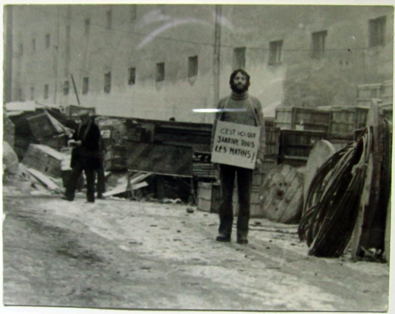 Mai departe, o mare surpriză e o lucrare pe care o știam, dar de care uitasem complet. Miklos Onucsan, în 1982, la marginea unui șantier, cu o pancartă în franceză care îi atârnă de gât și care spune, amar, Aici ajung în fiecare dimineață. Cred că e una dintre lucrările mele preferate din toată această expoziție.