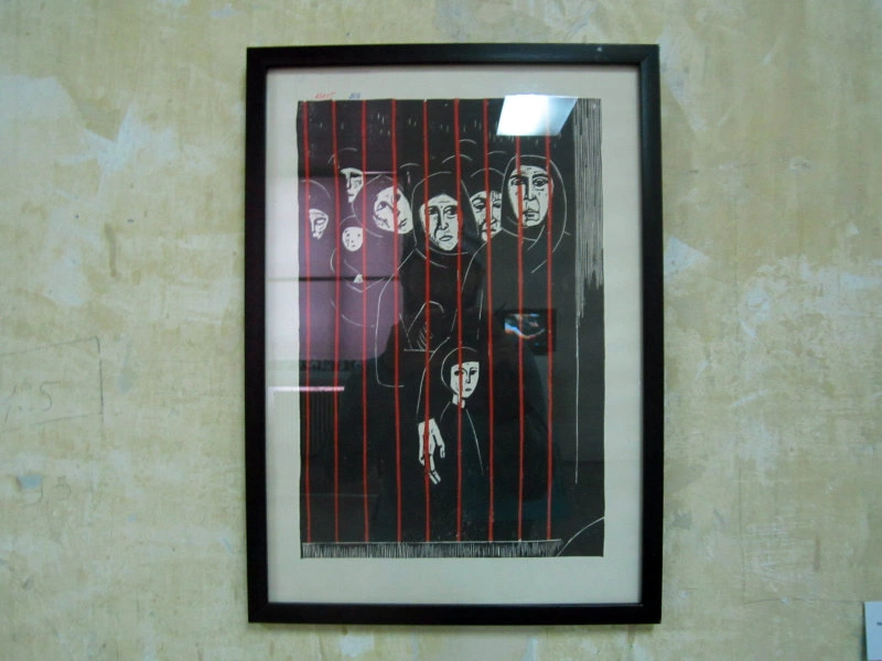 Lăsând toate astea la o parte, o altă surpriză neașteptată a fost să o văd pe Geta Brătescu în postura de artist socialist. Iată, mai jos, o linogravură din 1963, care face parte dintr-un triptic legat de activitatea greviștilor. Poate mă înșel, dar figura din dreapta imaginii pare chiar un autoportret. În acest moment, Geta Brătescu e cunoscută mai mult pentru o activitate intimă, de atelier artistic, nu pentru una angajată politic, nici măcar la nivel de reprezentare.