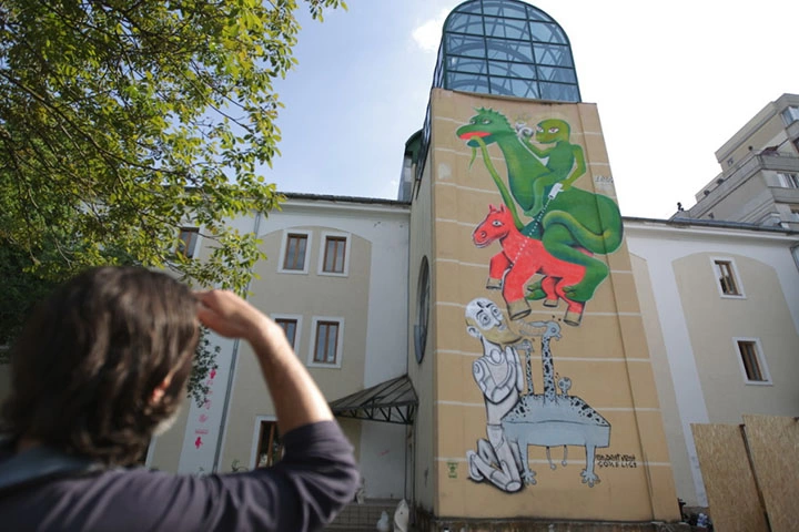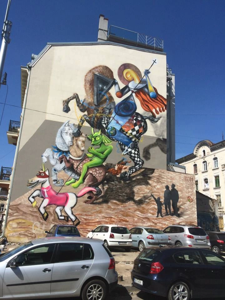 În primăvara lui 2015, pe un calcan din centrul Bucureștiului a trăit una dintre cele mai efemere picturi murale din istoria artei de stradă românești. Sfântul Gheorghe cu cap de domnișoară Pogany își înfigea sulița în două lighioane la fel de suprarealiste: un cal bicefal călărit de un balaur verde și un unicorn cu coadă roz și mască de Zorro. A rezistat pe zidul unei clădiri private vreo trei săptămâni, după care autorii ei, IRLO, Kero și Obie Platon, unii dintre cei mai relevanți street artiști români, au fost nevoiți să-l acopere cu vopsea. Declanșatoare pentru acest deznodământ au fost o postare de blog care alarma publicul despre simbolurile masonice din lucrare și confuzia preotului de la Biserica „Sf. Gheorghe” din apropiere. „În opinia mea, nu ştiu dacă este Sf. Gheorghe. Este, ca să spunem aşa, ca un fel de caricatură. Nu are nicio legătură cu ceea ce reprezintă o icoană a Sf. Gheorghe (…) Este, într-un fel, Sf. Gheorghe,” a declarat el atunci. A contribuit și o doamnă mason, președinta unei asociații de proprietari din zonă, care s-a ultragiat fiindcă nu voia să vadă „draci” pe pereți în drum spre serviciu.