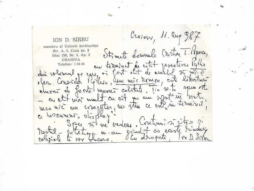 Stimate domnule Cristian T. Popescu, am terminat de citit povestirea Pythia din volumul pe care ai fost atât de amabil să mi-l oferi. Consider Pythia, un mic roman, este literatură umană de foarte umană calitate. Țin să-ți spun asta – cu atât mai mult cu cât nu am văzut în viața mea nici un computer, nu știu ce este „un terminal”, ce înseamnă „display”.
