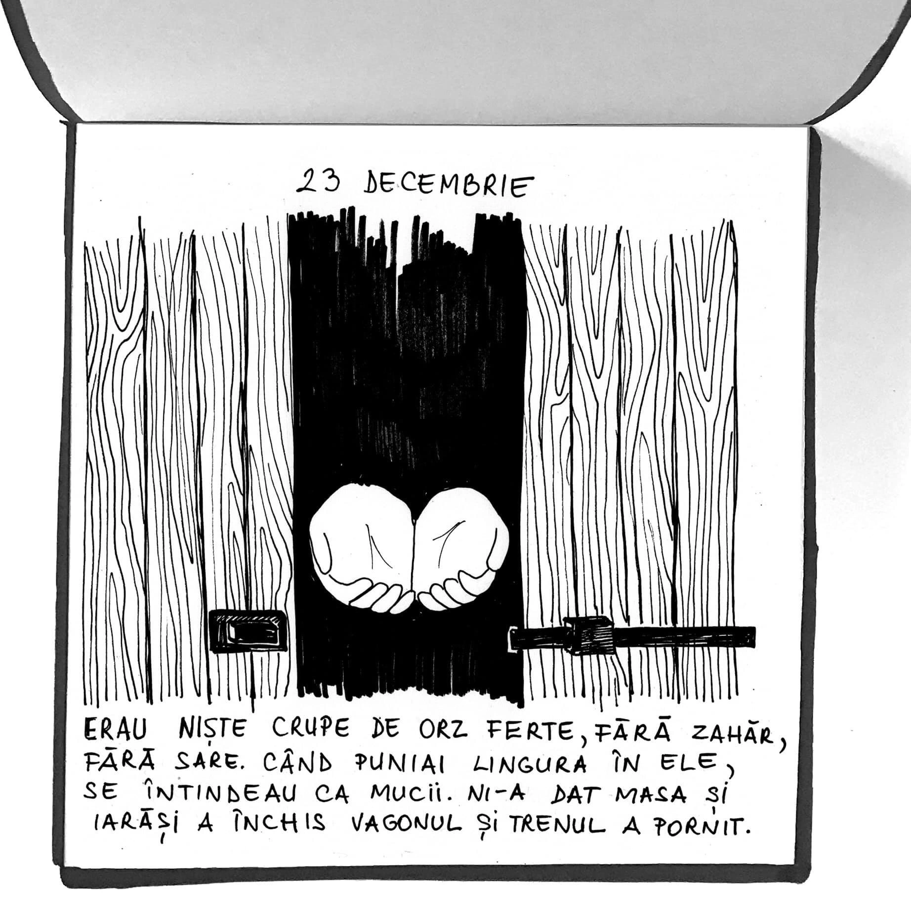 „A doua zi [trenul] s-a oprit iarăși într-o gară. S-a deschis ușia vagonului și iarăși îl ia pe un bărbat să ajute a aduce caș. Lumia, acu parcă mai curioasă, așteaptă să mănânce caș. Se gândia la caș de oaie, căci aceluia la noi îi spunia caș. Când colo vine bărbatul acela cu o vadră de caș. Erau niște crupe de orz ferte, fără zahăr, fără sare. Când puniai lingura în ele, se întindeau ca mucii. Ni-a dat masa și iarăși a închis vagonul și trenul a pornit.”