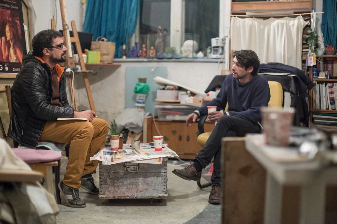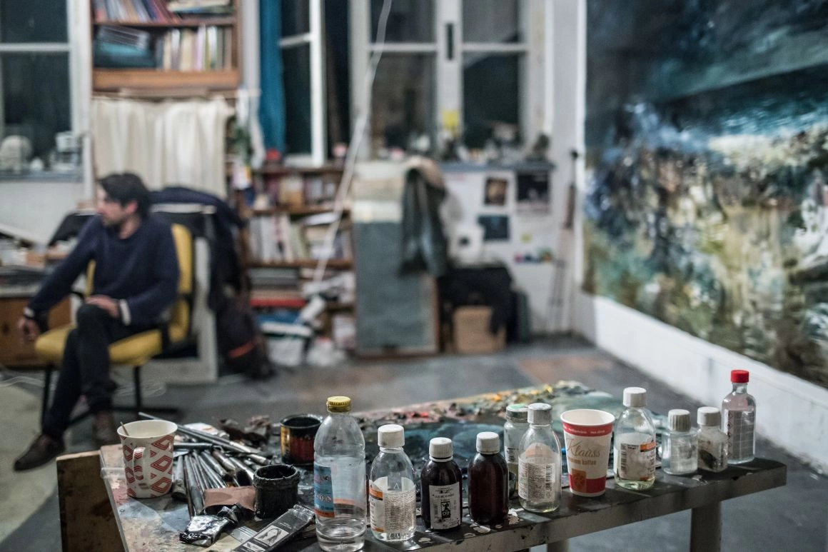 Andrei Gamarţ împarte odaia mai mică decât o garsonieră, cu tavan înalt şi ferestre mari, cu încă o artistă. Când nu-şi porţionează timpul între familie şi colaborările ca designer, vine aici ca la job şi stă singur cu pânza, departe de alergarea cotidiană şi aproape de cărţile de poezie dintr-o mică bibliotecă. Are trei volume de poeme publicate şi de trei ori mai multe expoziţii de pictură pe care le consideră reprezentative. Spune că e poet „chiar şi fiind pictor”. Vorbeşte stins şi cu pauze – ca şi cum ar căuta să exprime ceva ce nu poate fi exprimat – despre arta lui şi despre relaţia cu spaţiul în care lucrează.