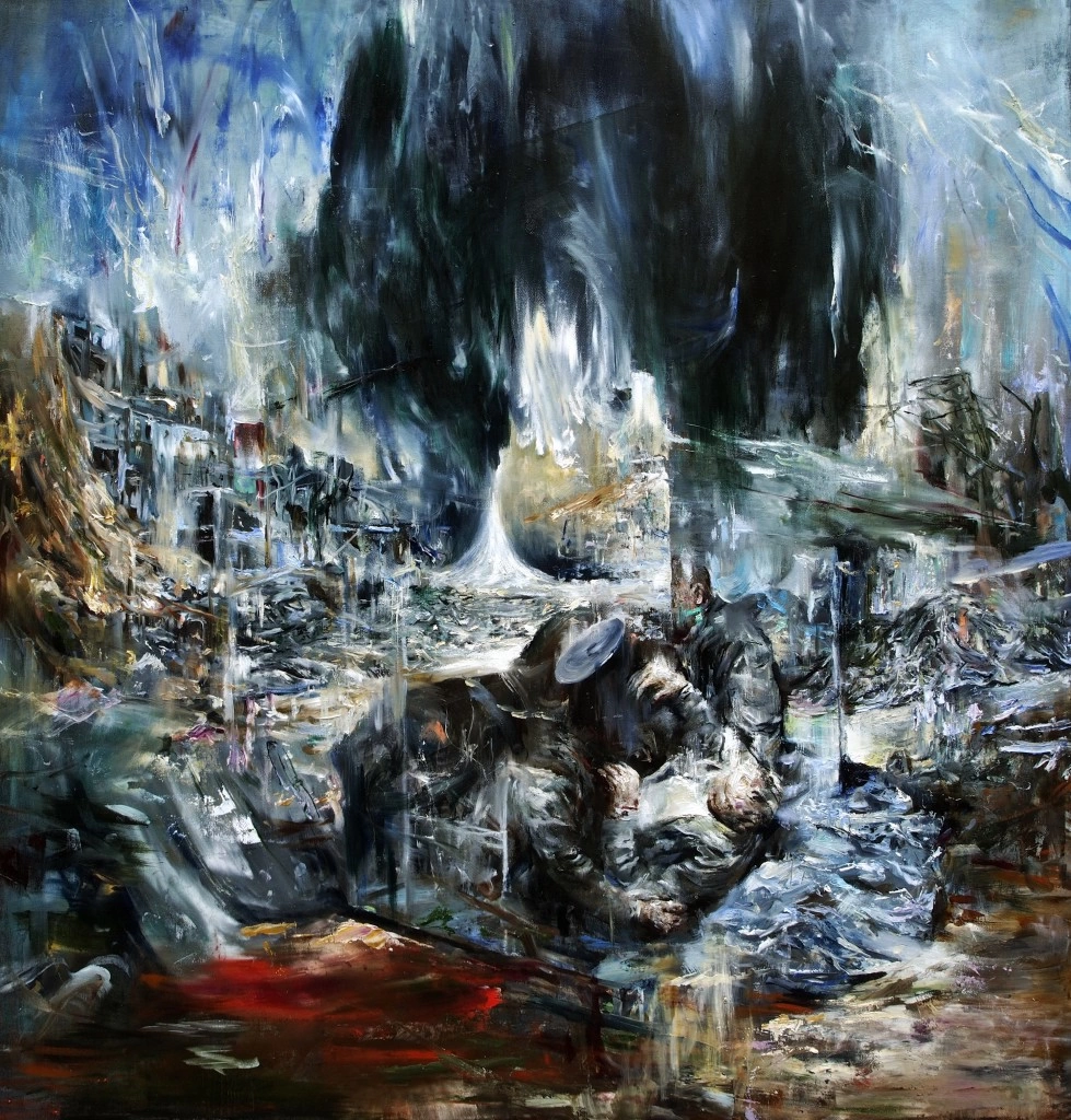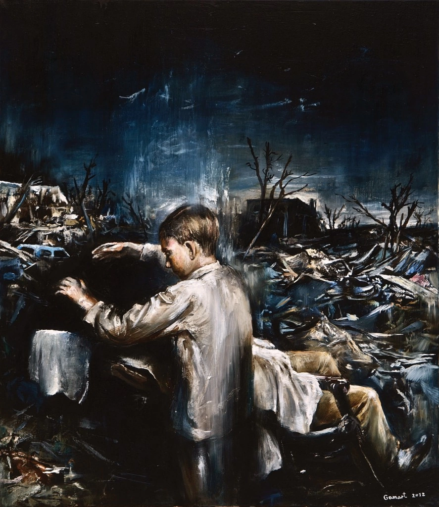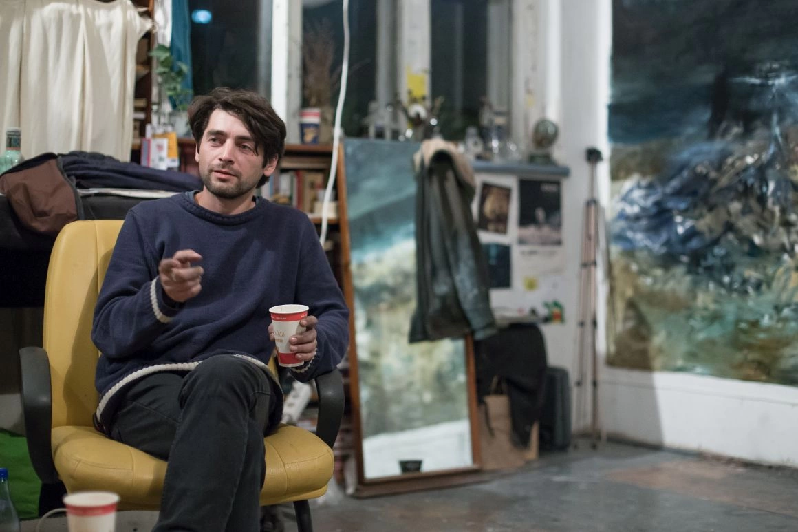 Când am ajuns în atelierul lui Andrei Gamarţ, într-o clădire întunecată şi veche a Bisericii Luterane, care-a fost şi şcoală, şi bancă şi unde locuiesc acum oameni nevoiaşi pe chirii mici, l-am găsit cu mâinile înnegrite de vopsea şi bucuros de „uau”-ul pe care l-am aruncat spre ditamai pânza lipită de-un perete. Doi metri pe cinci metri, cea mai mare lucrare a lui de până acum, începută recent în cadrul primei bienale de apartament şi de studio din lume. Un eveniment menit să apropie publicul de spaţiile de lucru ale artiştilor şi de galeriile de apartament. De luni până vineri, între 4 octombrie şi 5 noiembrie, de la 13 la 18, un webcam montat pe peretele opus lucrării va intra puţin în intimitatea pictorului din Chişinău. Puteţi intra aici să-l vedeţi pictând live. Mă uit la camera de pe perete şi îl întreb: