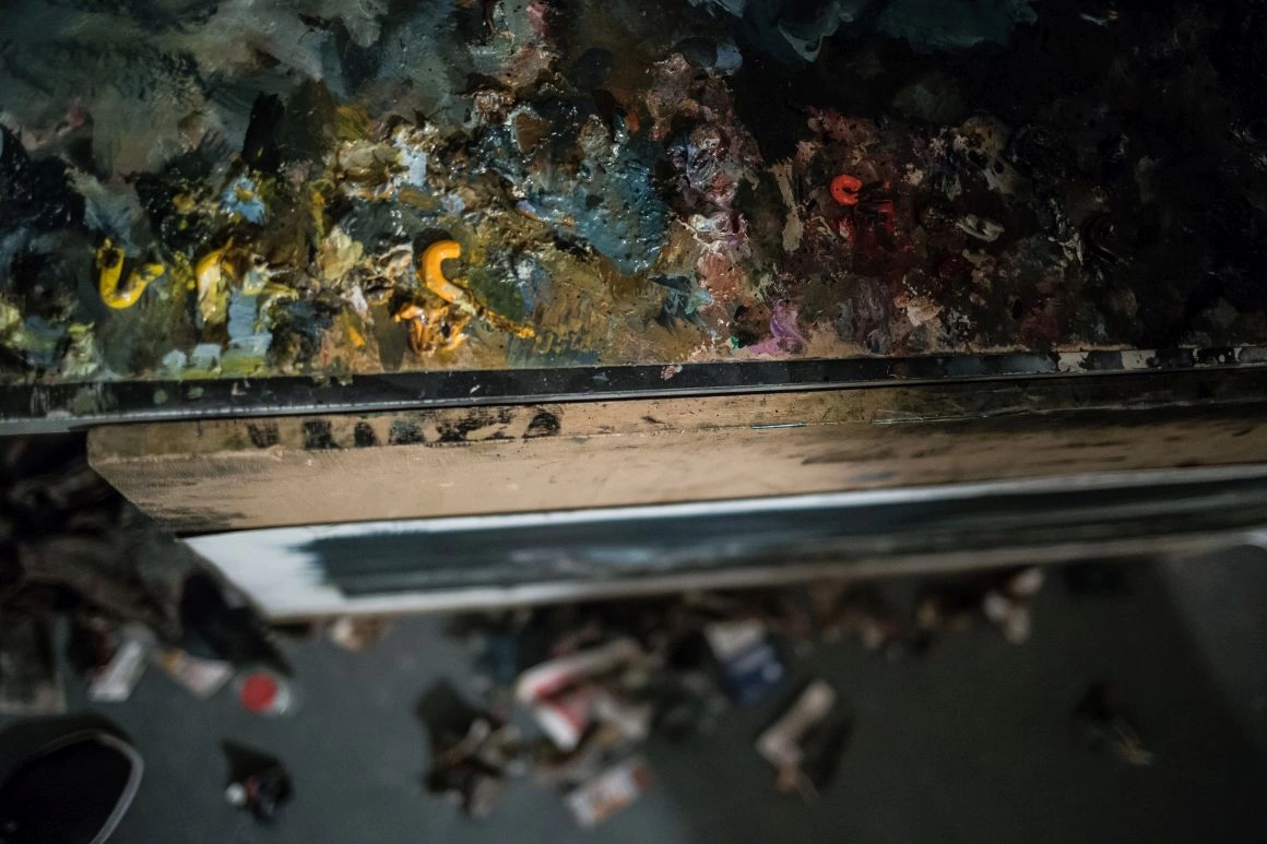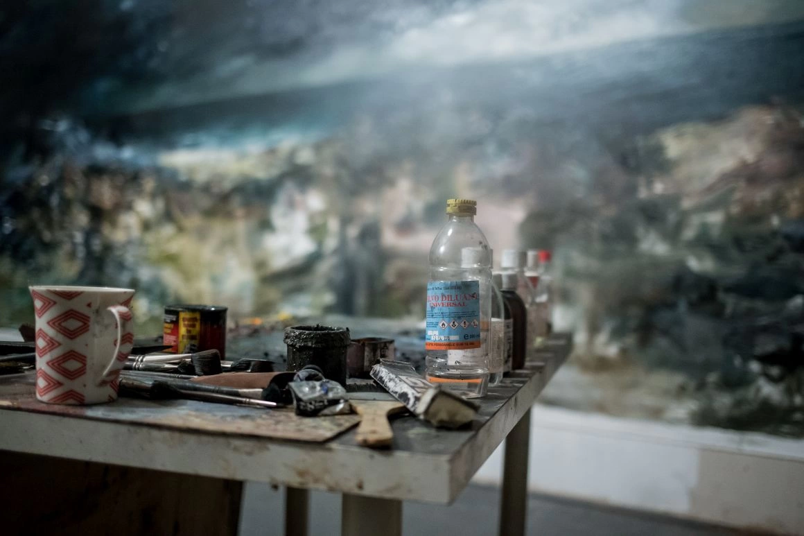 Încerc să mă ţin de un program, să vin zilnic. Am zile în care pur şi simplu nu pot să lucrez sau stau şi mă uit la pânză, dar totuşi vin. Conexiunea asta trebuie să existe, ca şi cum ai merge la un job. E un loc unde trebuie să fii. Să văd măcar lucrarea, ca apoi să mă gândesc la ea în timp ce merg spre casă. Mai nou, vin de la 1 [după-masa]. Copiii încep şcoala la 8 şi termină la 12. Sunt în şcoli diferite, iar eu o duc pe cea mică şi Roxana pe cea mare. Lucrez cam cinci-şase ore pe zi aici, maxim. Nu pot mai mult, că am şi alte treburi. Şi familia, şi jobul.