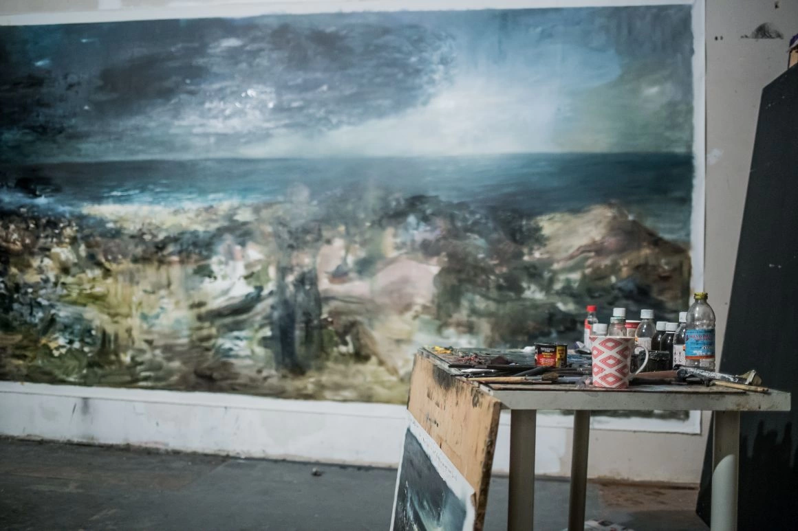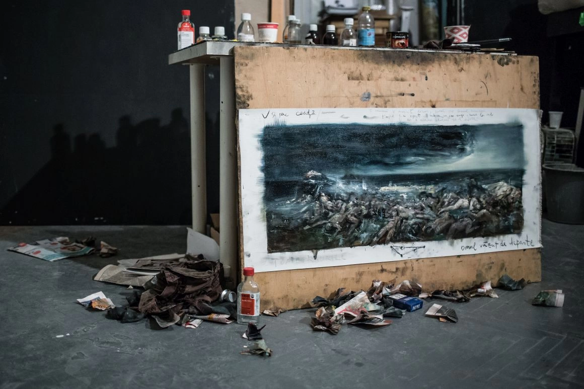 Sunt lucruri pe care le văd pe stradă, de exemplu. Când merg de la atelier spre casă, de obicei mă gândesc la ce-am lucrat peste zi. [Îmi arată o pânză mică lipită pe un placaj din spatele meu]. Asta e schiţa pentru lucrare. Voiam să fac nişte oameni care dorm. Şi mi-am dat seama că e foarte dificil să redai că sunt vii. Când dormi, nu eşti acolo. Eşti un obiect care din când în când tresare şi se întoarce, dar persoana este plecată, omul ca entitate nu este acolo. Nu am vrut să fie o pânză macabră. Şi eram pe stradă, în Piaţa Universităţii, şi mă gândeam la pânză şi vedeam oamenii care aşteaptă în staţie, îi vedeam de departe, de pe partea cealaltă, cum aşteaptă şi se uită şi am zis că ar fi interesant să-i includ pe ei în lucrare. Oameni care aşteaptă ceva. Genul ăsta de lucuri. Lucruri pe care le vezi. Până la urmă nu ştiu cum va arăta, nu-mi dau seama.
