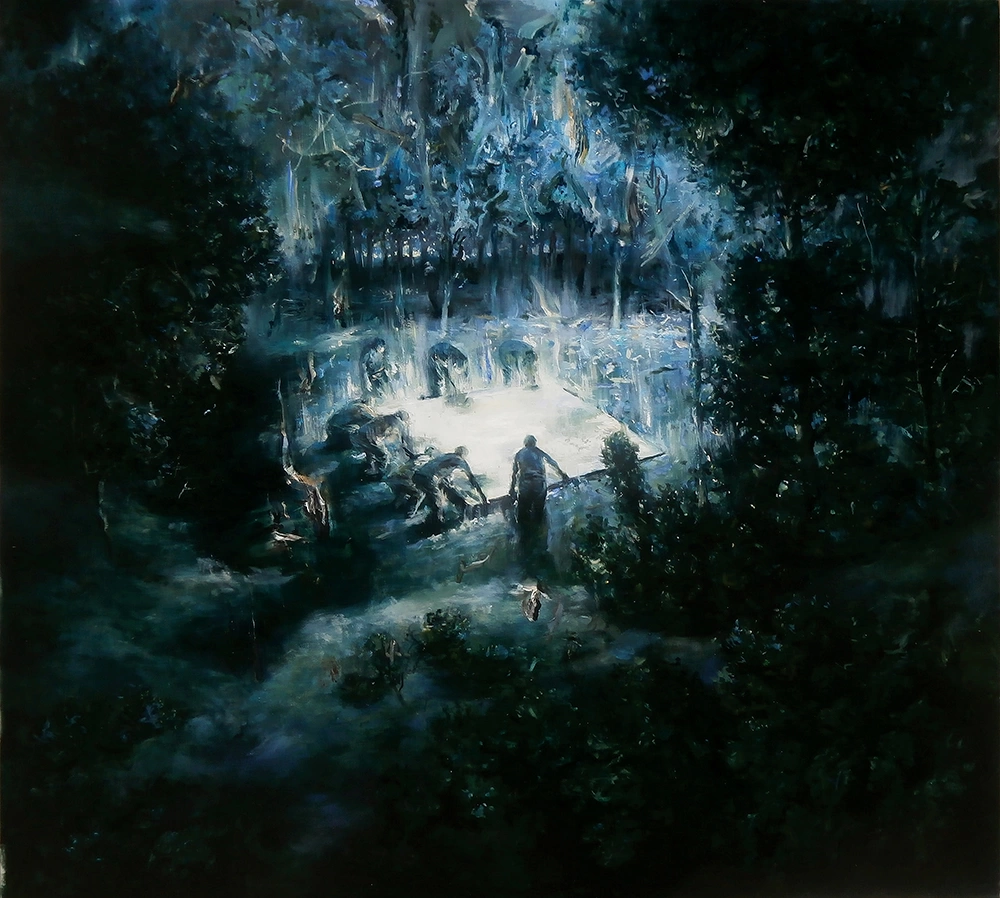 E important. Aşa funcţionăm noi. Vii aici între patru pereţi, cu imaginile şi gândurile tale, şi lucrezi. E ca şi cum ai merge într-o peşteră unde eşti singur cu lucrarea. Chiar dacă e cineva în spate, când lucrezi, faci abstracţie de mediu. Ai pensula în mână şi ea se atinge de pânză, ai contactul ăsta, nu poţi să-ţi sustragi atenţia. De ce i-am spus eu [proiectului] „Un alt cuvânt pentru dorinţă”? Când merg în muzee şi văd o lucrare care îmi place mult, aş vrea să ştiu cum a fost făcută. Eu ştiind care este procesul meu când lucrez, că încep ceva şi iese cu totul altceva. E un proces lung care implică nu doar ideea iniţială, dar şi ce se întâmplă pe parcurs, experienţele sau lecturile tale. Se adună ca un ghem şi la sfârşit iese cu totul altceva. O pânză o faci într-un timp îndelungat. În timpul ăsta se întâmplă lucruri cu tine ca om, care afectează pânza.