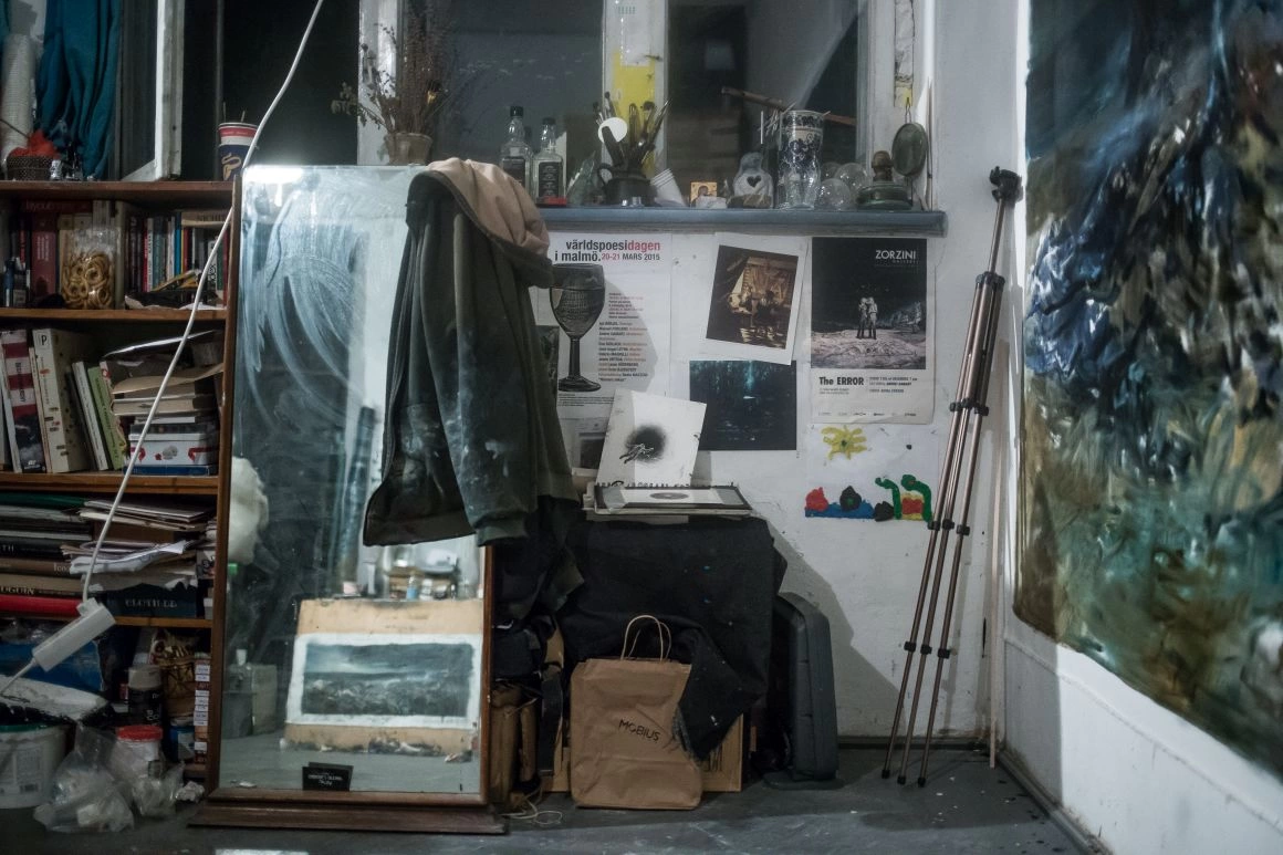 Atelierul ăsta îl împart cu încă o artistă, Alexandra Baciu. Acesta este peretele meu, acela-i al ei. Am pânze – o parte sunt la galerie, o parte sunt aici. Mai sunt panourile [pentru cutiile din expoziţia „Mirror For The Full Moon”], la care am muncit o lună. Eu le-am făcut, eu le-am montat, eu le-am pus instalaţie electrică. Era întuneric şi fiecare cutie avea o lumină sus. Mai sunt tot felul de lucruri care se adună. Am şi o oglindă, pe care o folosim la comun. Sunt momente în care nu ai model şi atunci foloseşti oglinda, pentru figura umană sau mână sau ceva.