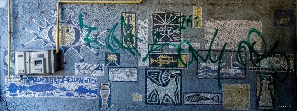 Clipul British Pathé de mai jos poate să te ajute să-ți faci o idee despre cât de modernă era clădirea construită în 1966, în zona Dudești. Ea mai există și astăzi, iar Dumitru Rusu speră că la fel se poate spune și despre mozaicurile sale, realizate de artiștii Constantin Blendea, Mircea Velea și Constantin Berdilă. Mozaicurile împodobesc holul principal al clădirii, precum și sala de așteptare a secției de balneofizioterapie și radiologie. Mozaicul din holul principal se află într-o stare de neglijare avansată și e obturat de compartimentarea unei farmacii. E unul dintre cazurile în care înscrierea lucrării pe lista monumentelor istorice ar contribui la redarea ei privirilor celor care așteaptă să se trateze.
