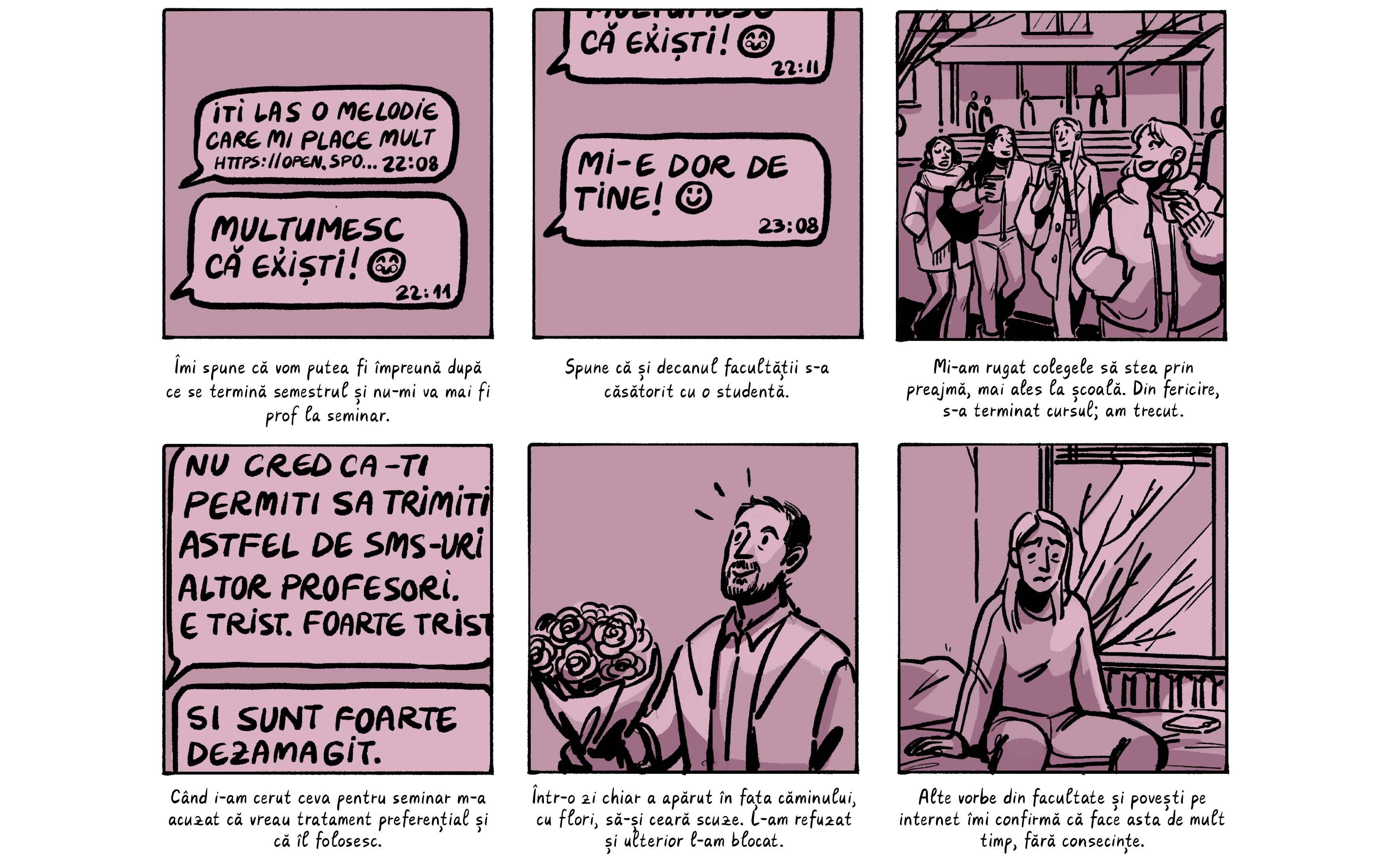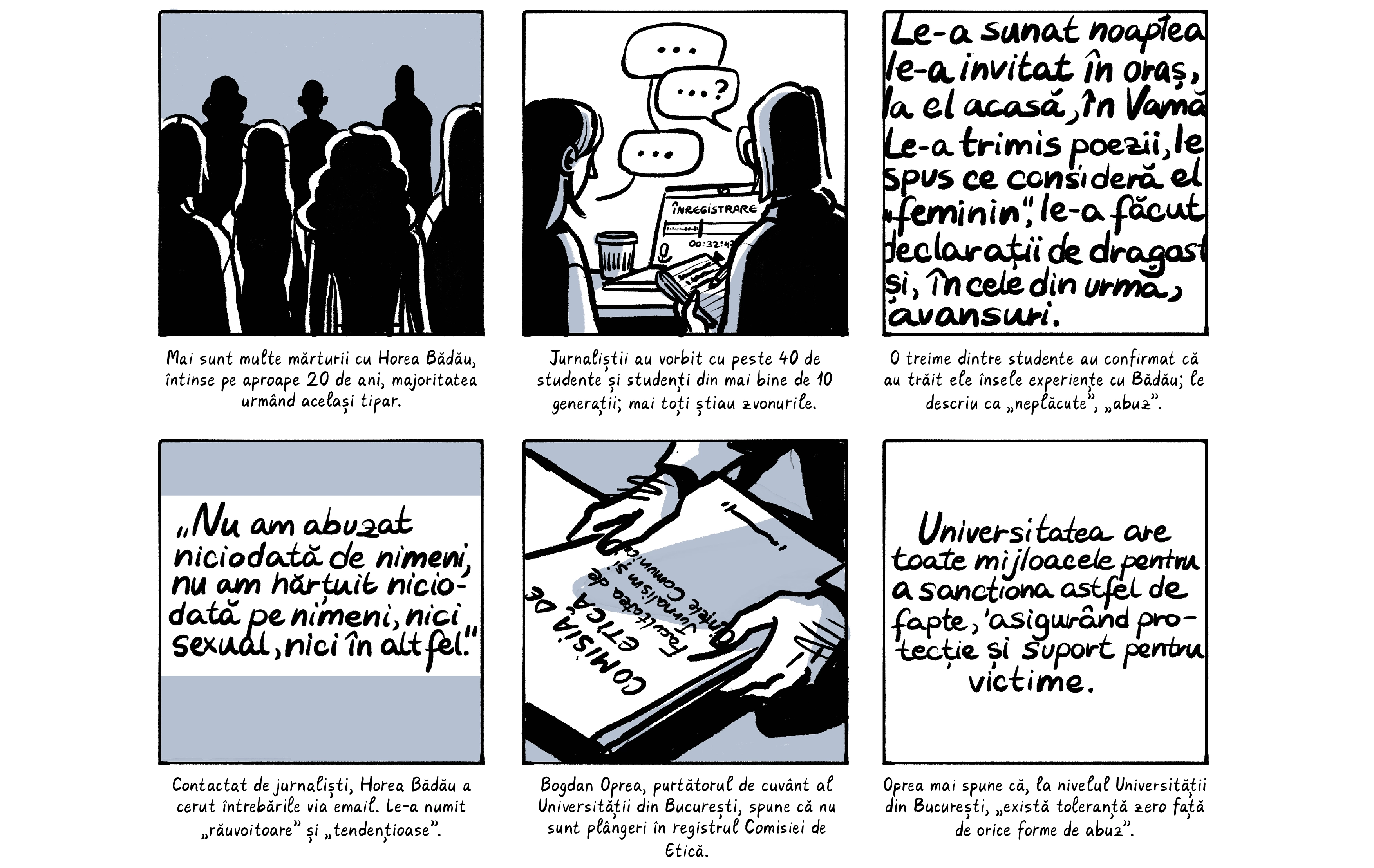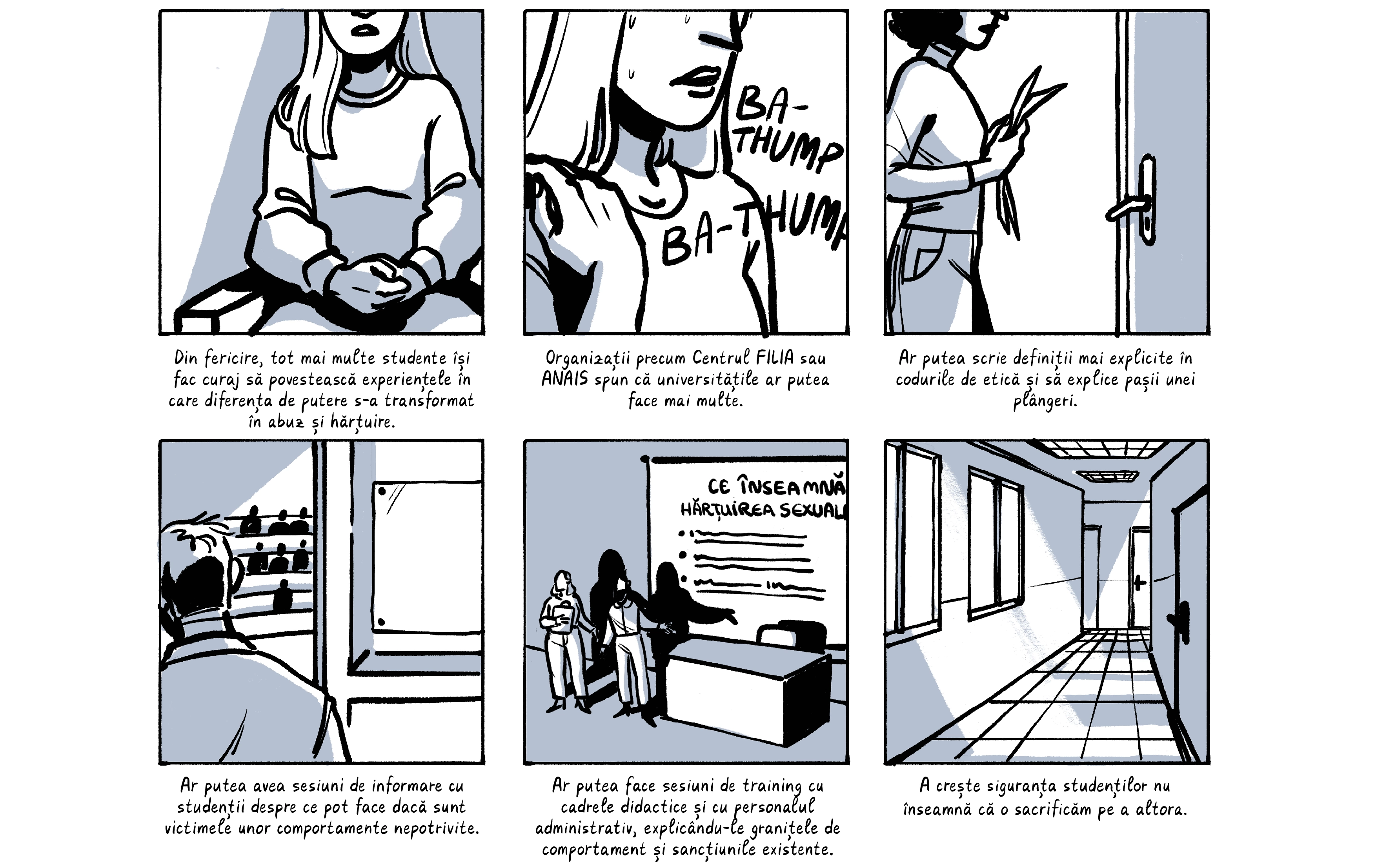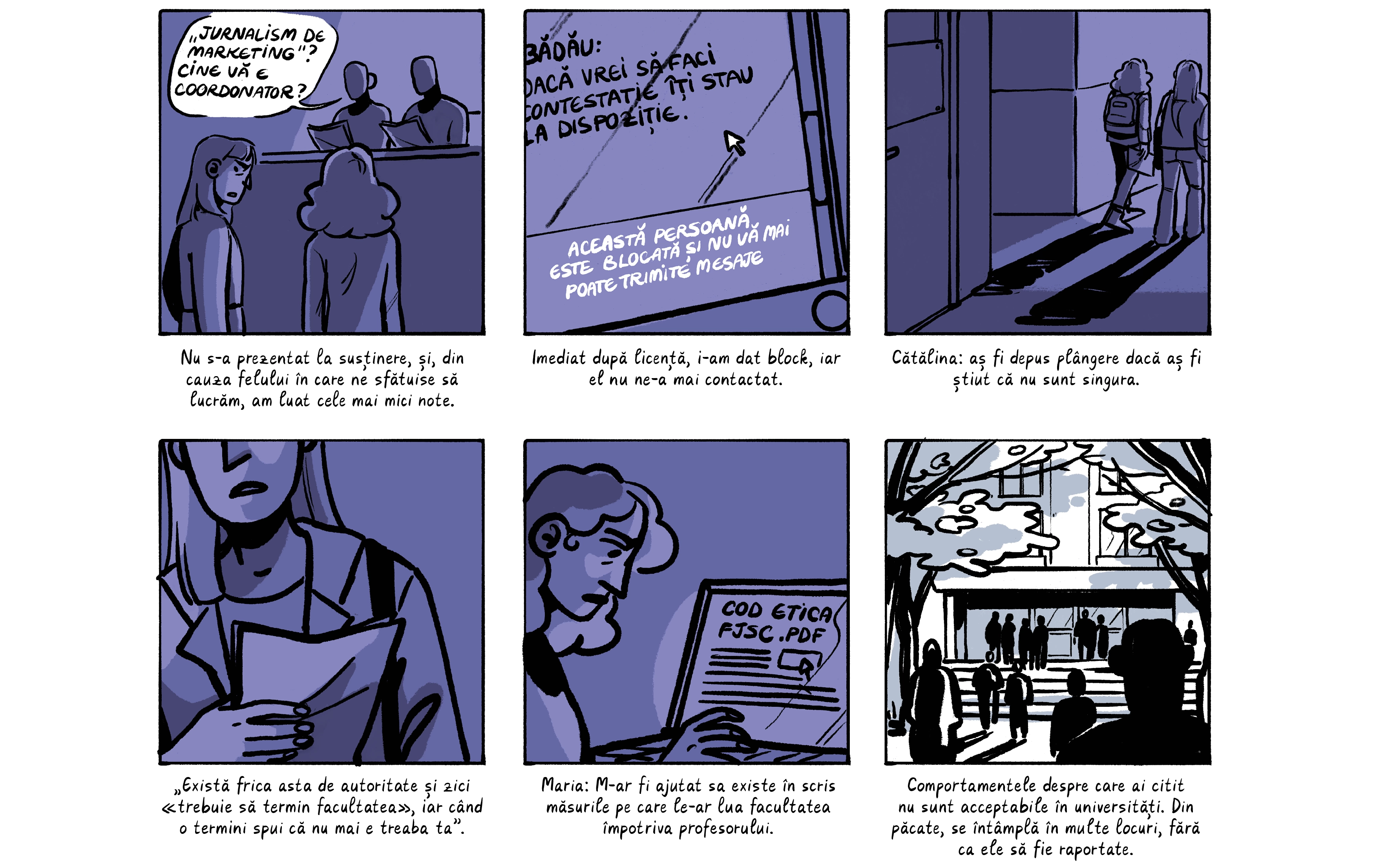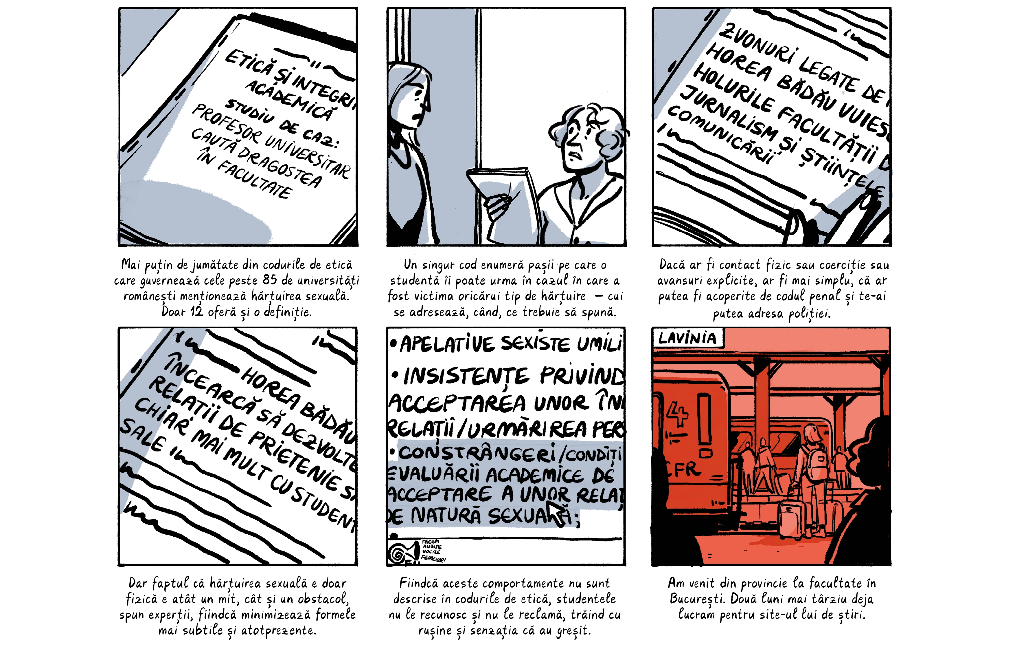 Banda desenată de mai jos preia o parte dintre poveștile absolventelor, care apar cu pseudonime ca să le protejăm identitatea. Ele sunt contextualizate de o discuție despre nevoia de a trata cu mai multă seriozitate abuzurile din universitățile din România, unde o treime dintre studente spun că au fost hărțuite sexual. Dacă reacția celor peste 200 de studenți actuali de la FJSC, care au semnat o sesizare cerând măsuri din partea facultății și universității, poate fi folosită ca o măsură a interesului, putem spune că ei vor această discuție.