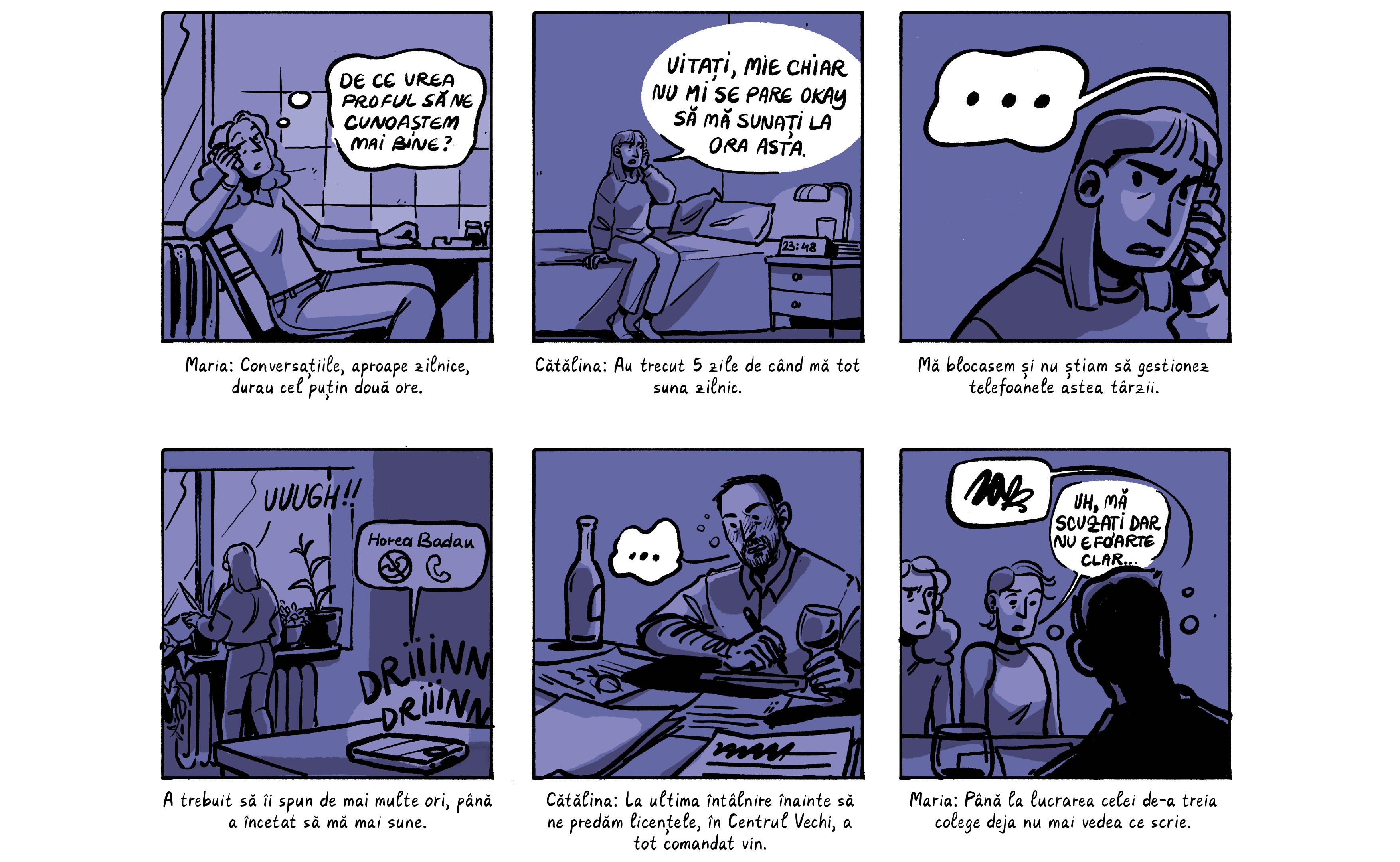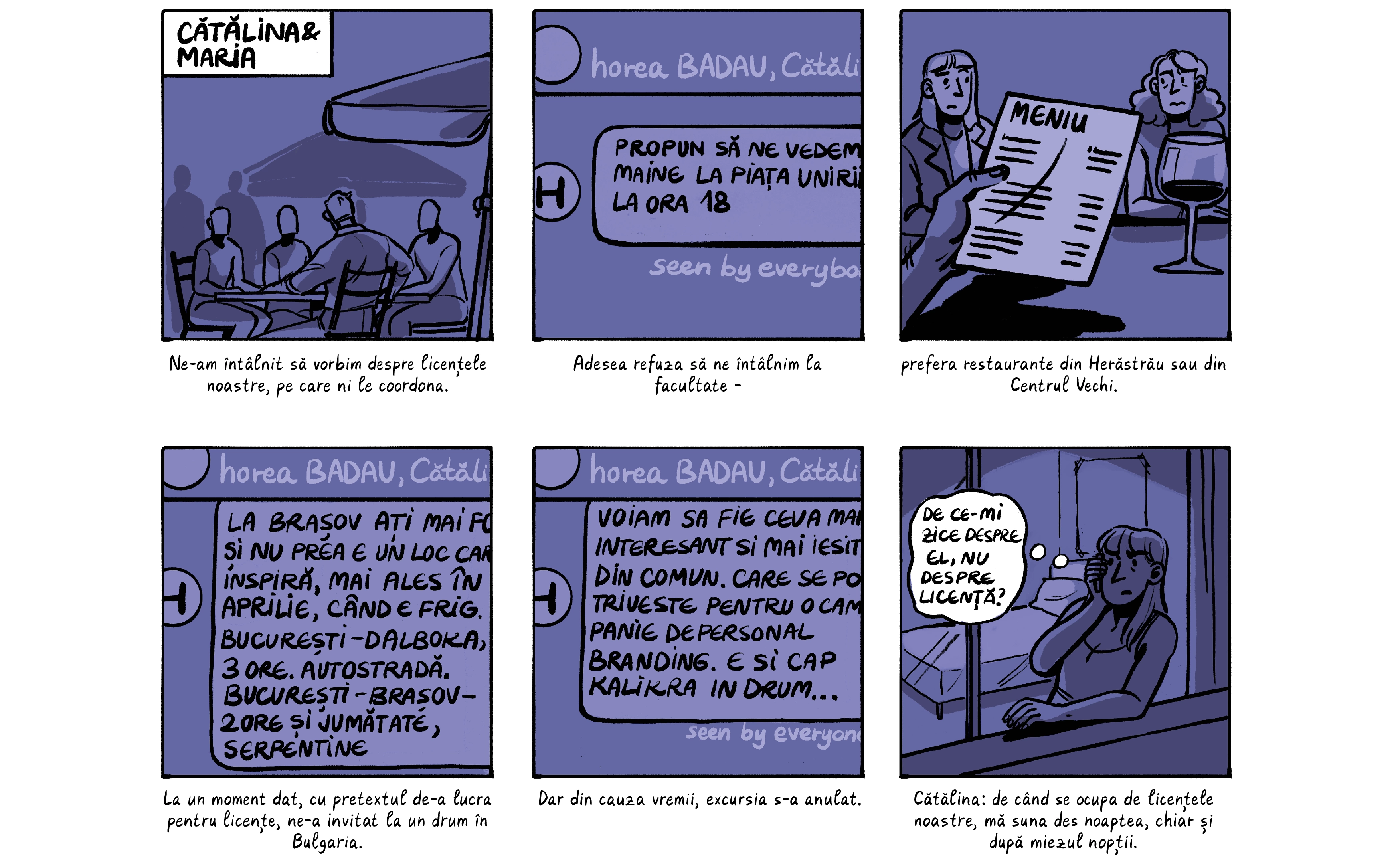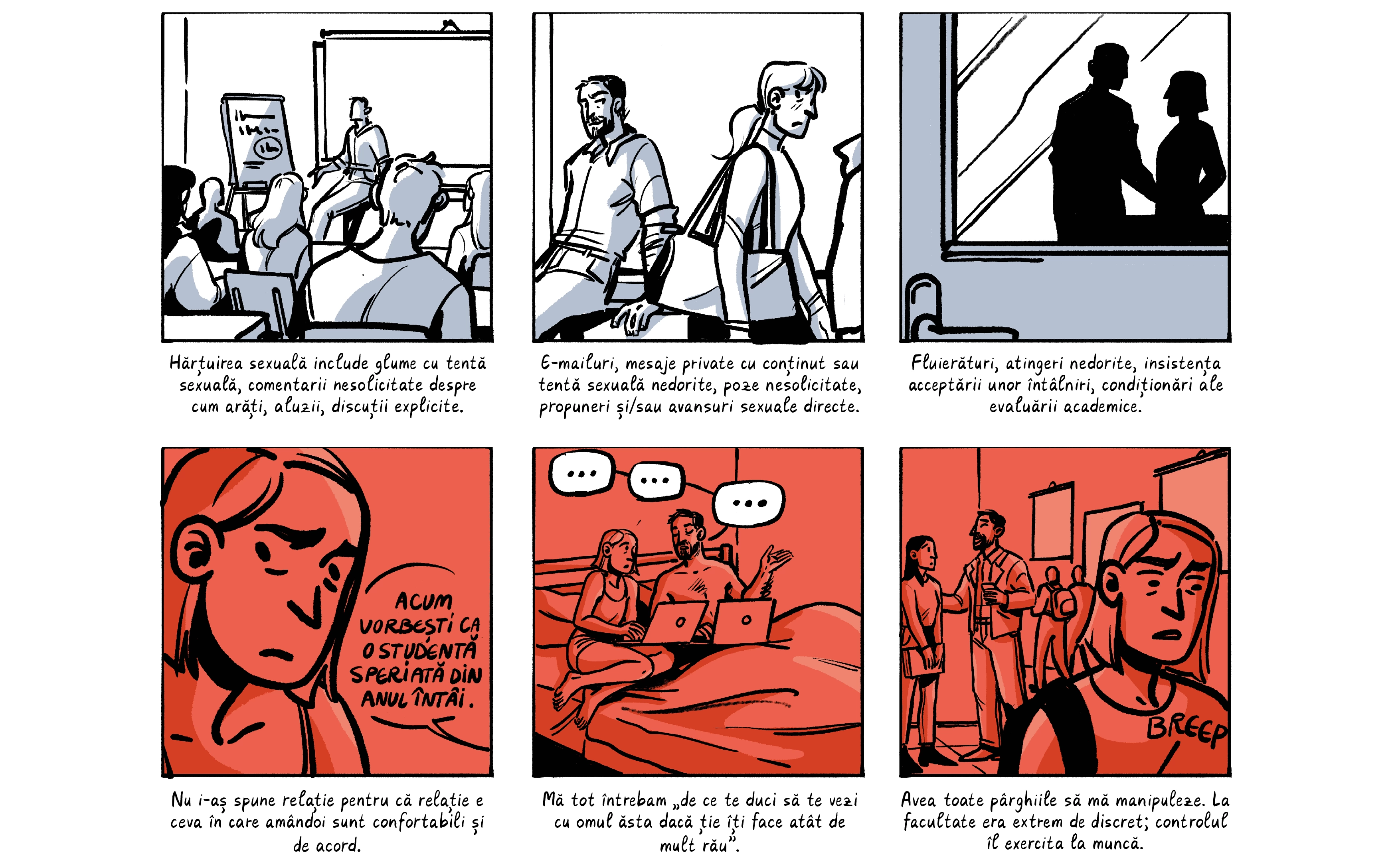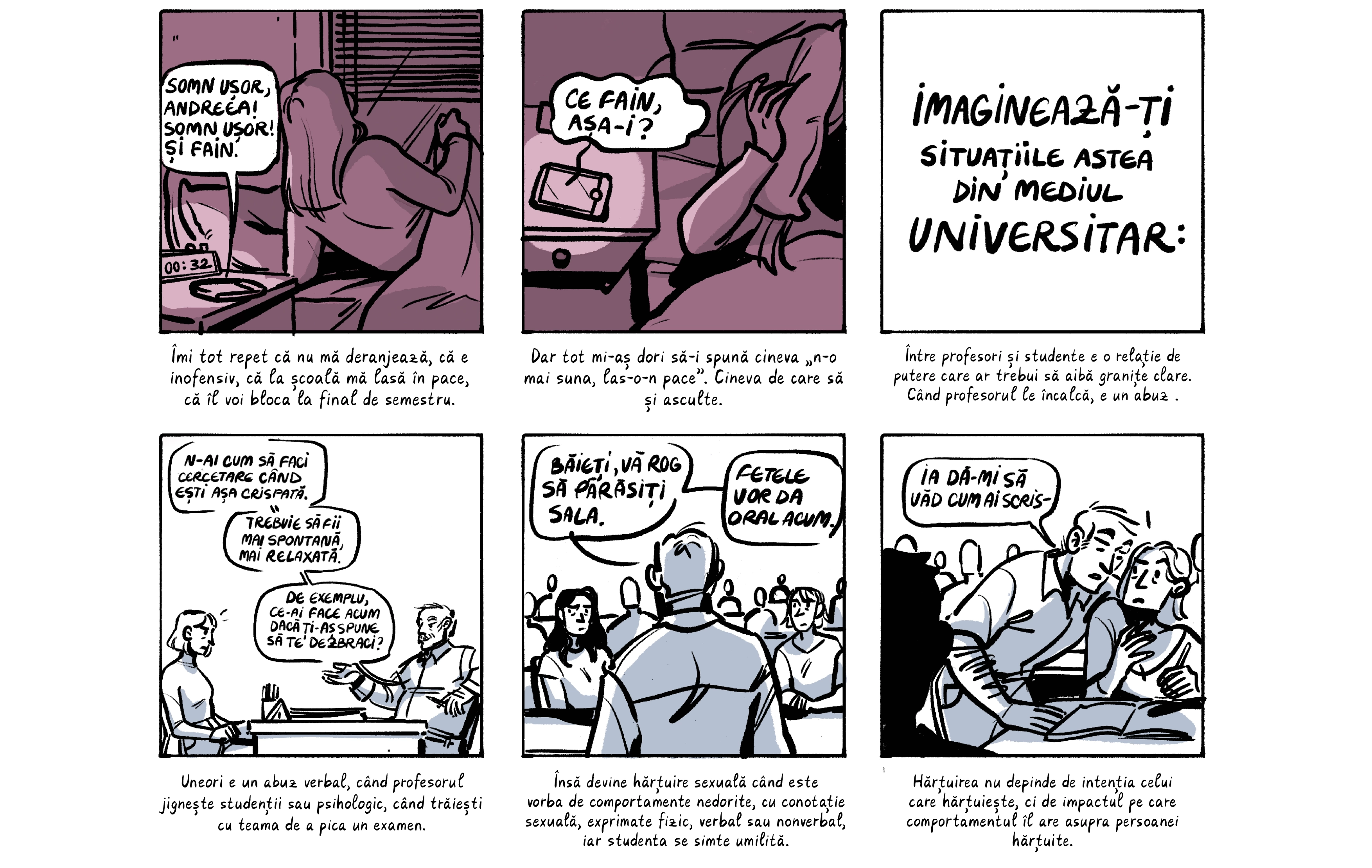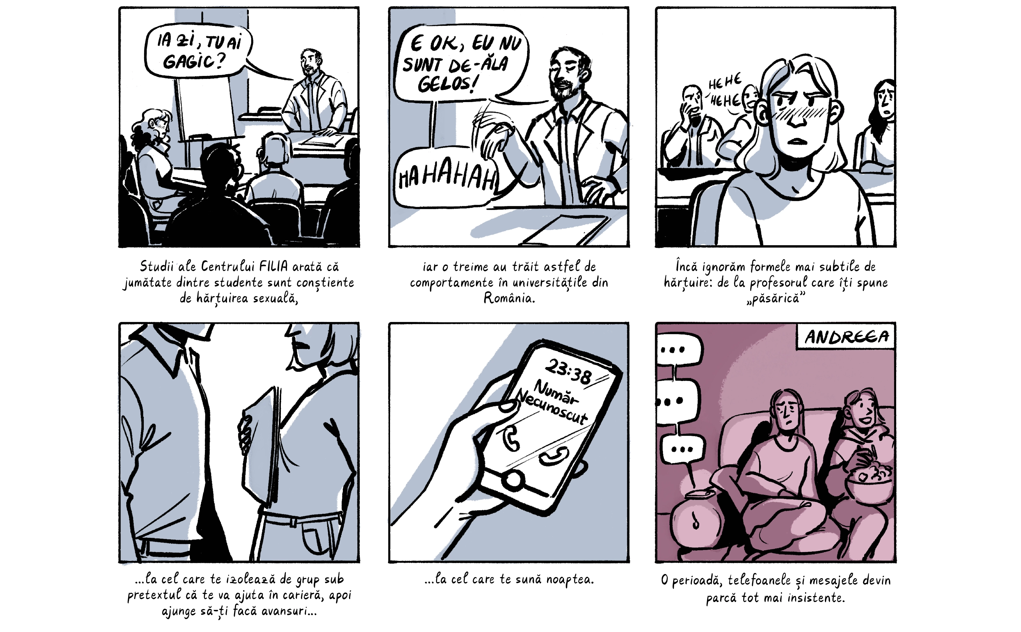 Banda desenată de mai jos preia o parte dintre poveștile absolventelor, care apar cu pseudonime ca să le protejăm identitatea. Ele sunt contextualizate de o discuție despre nevoia de a trata cu mai multă seriozitate abuzurile din universitățile din România, unde o treime dintre studente spun că au fost hărțuite sexual. Dacă reacția celor peste 200 de studenți actuali de la FJSC, care au semnat o sesizare cerând măsuri din partea facultății și universității, poate fi folosită ca o măsură a interesului, putem spune că ei vor această discuție.