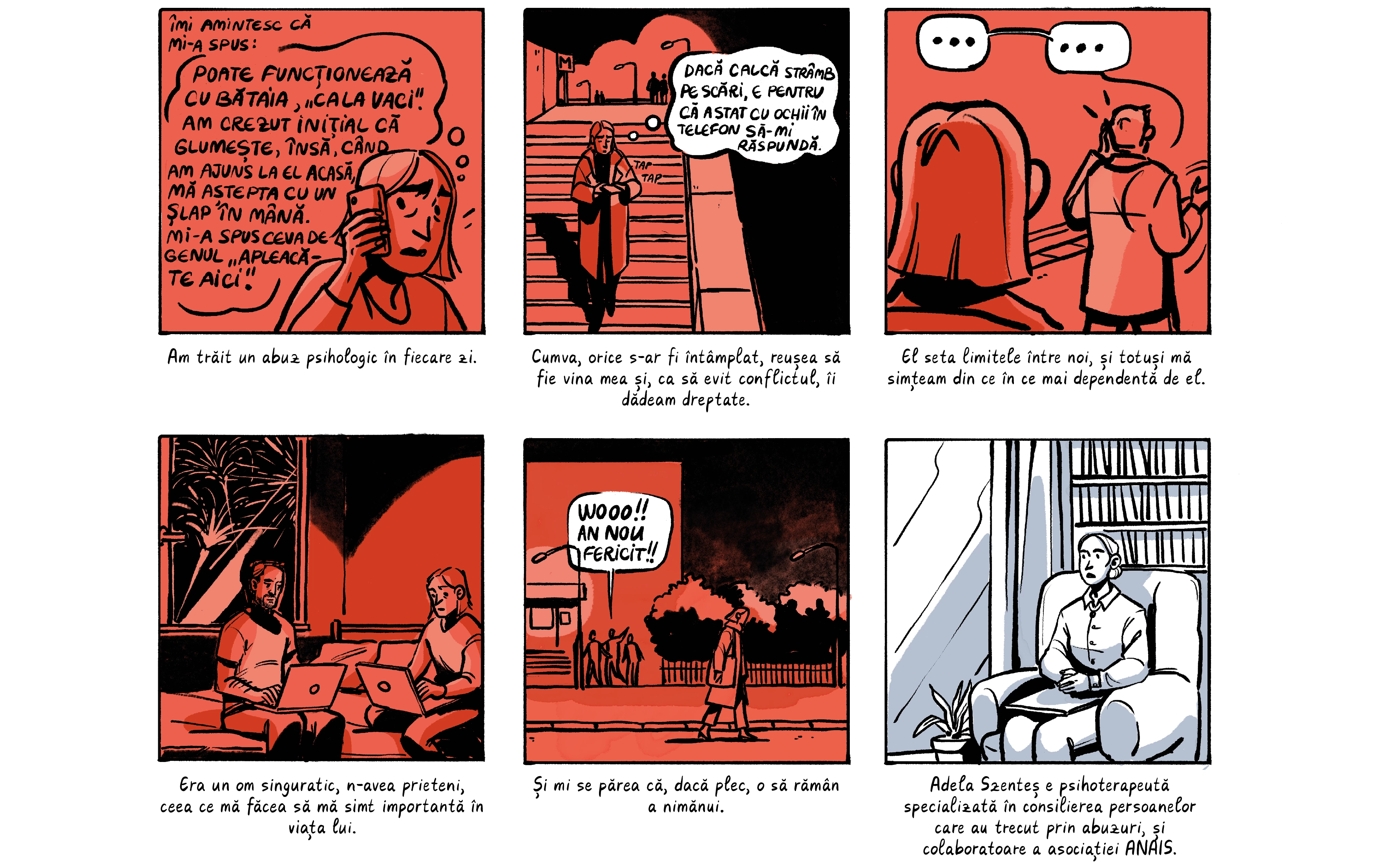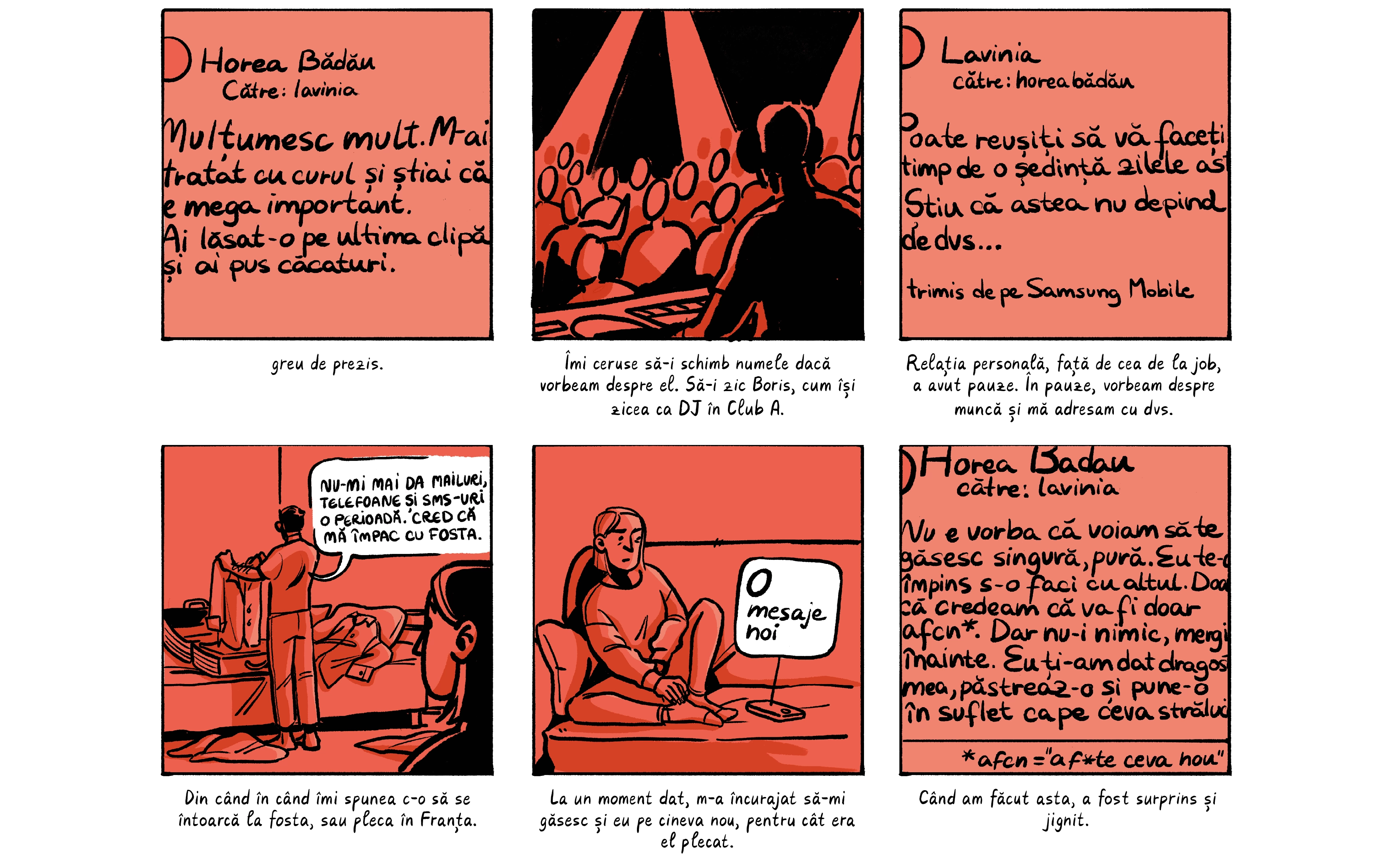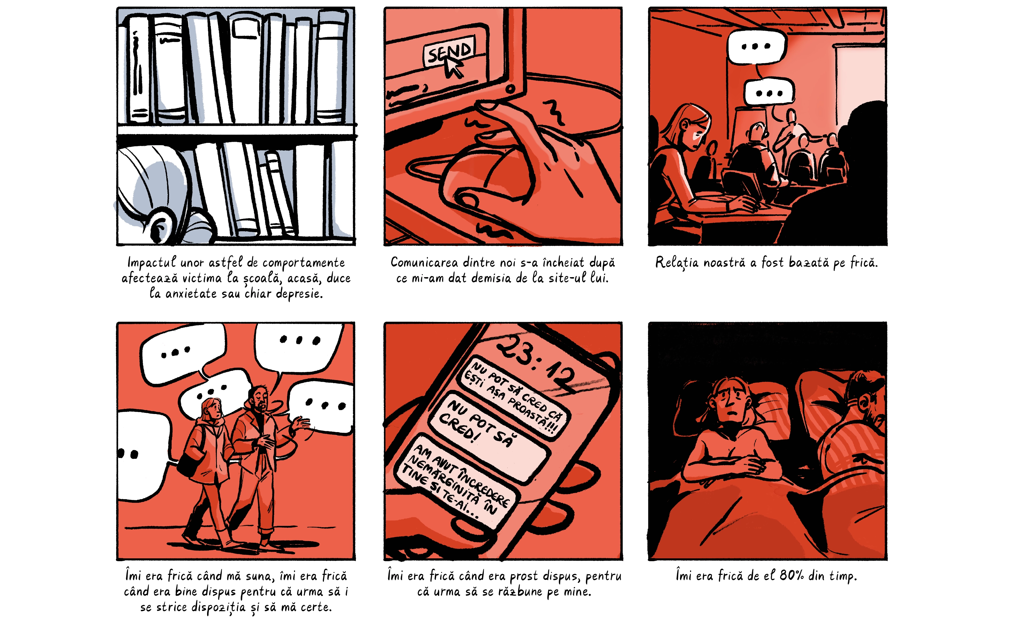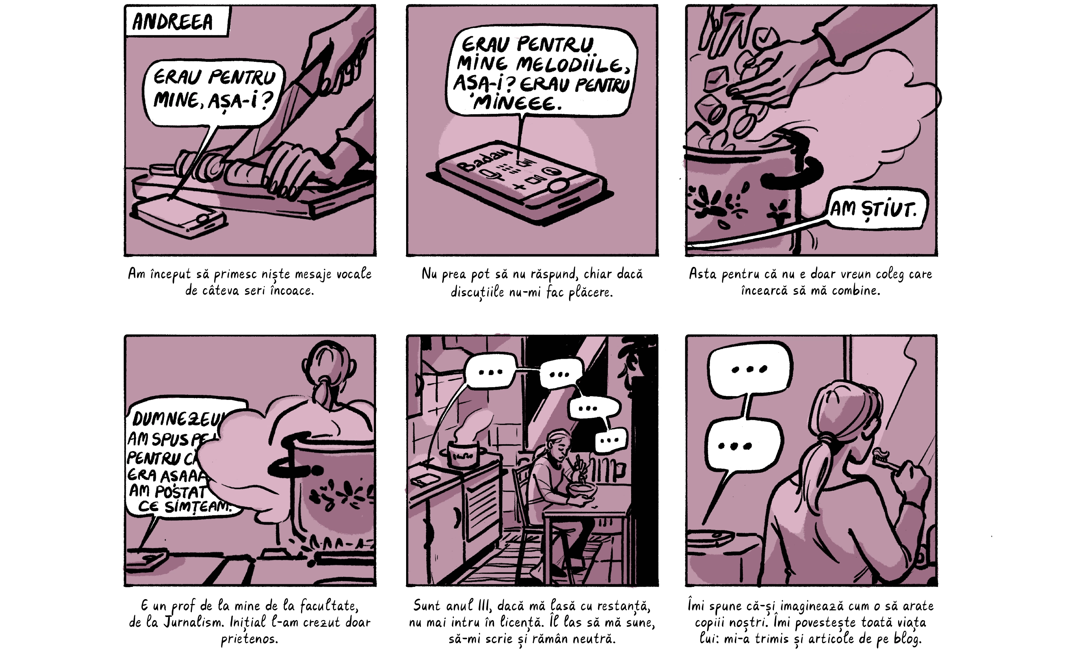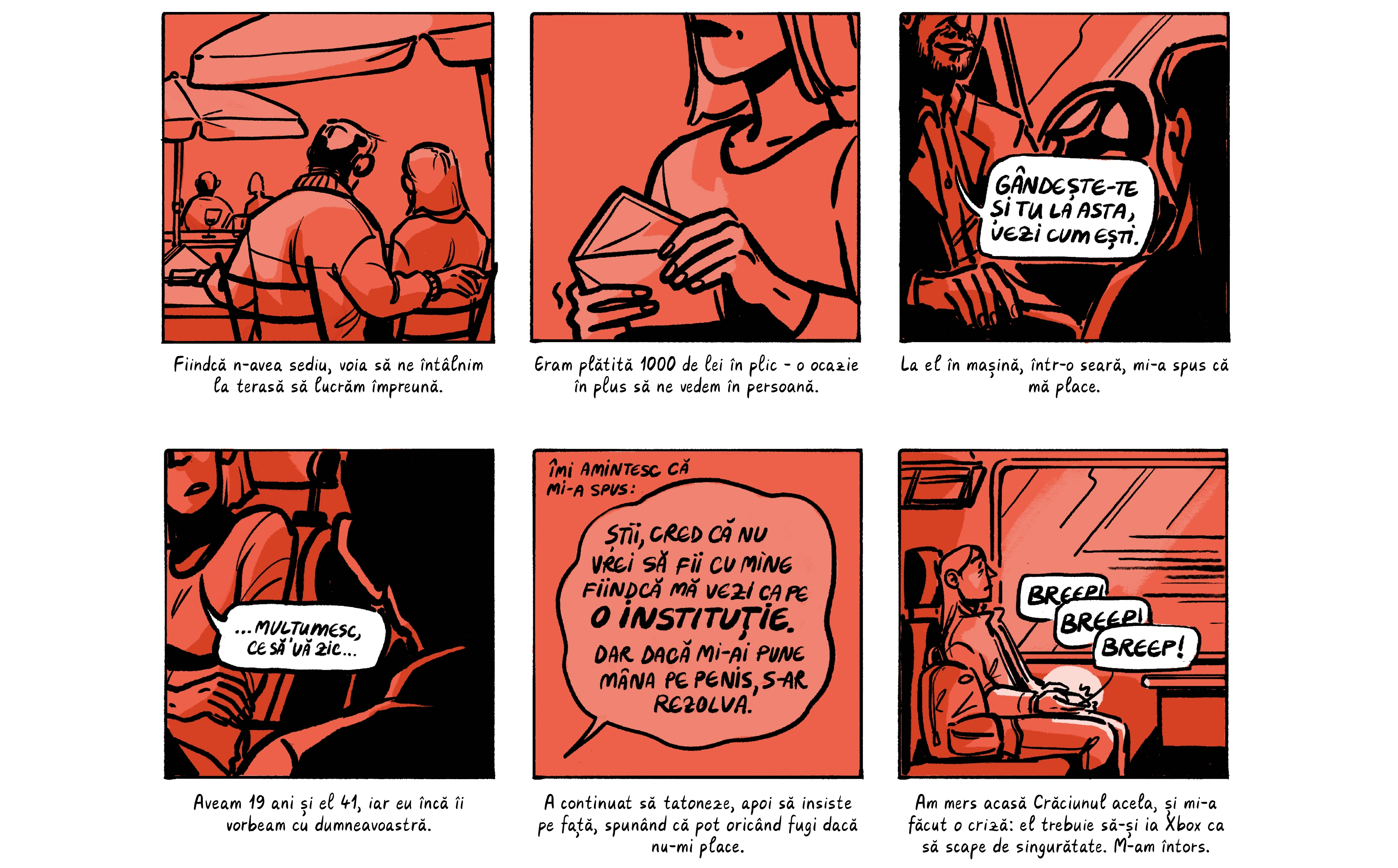 Banda desenată de mai jos preia o parte dintre poveștile absolventelor, care apar cu pseudonime ca să le protejăm identitatea. Ele sunt contextualizate de o discuție despre nevoia de a trata cu mai multă seriozitate abuzurile din universitățile din România, unde o treime dintre studente spun că au fost hărțuite sexual. Dacă reacția celor peste 200 de studenți actuali de la FJSC, care au semnat o sesizare cerând măsuri din partea facultății și universității, poate fi folosită ca o măsură a interesului, putem spune că ei vor această discuție.