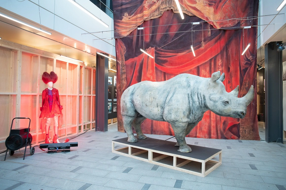 Mențiune importantă: Pentru prima dată în afara scenei/spațiului de depozitare din teatrul „de baștină”, rinocerul, creat de scenograful Helmut Stürmer, devenit simbol în spectacolul Faust, pus în scenă de regizorul Silviu Purcărete în 2007, la Teatrul Național „Radu Stanca” din Sibiu și jucat de nenumărate ori în acești ani, a putut fi văzut în Piața Amzei, împreună cu cortina imensă a spectacolului, doar pe durata Bienalei de Scenografie.