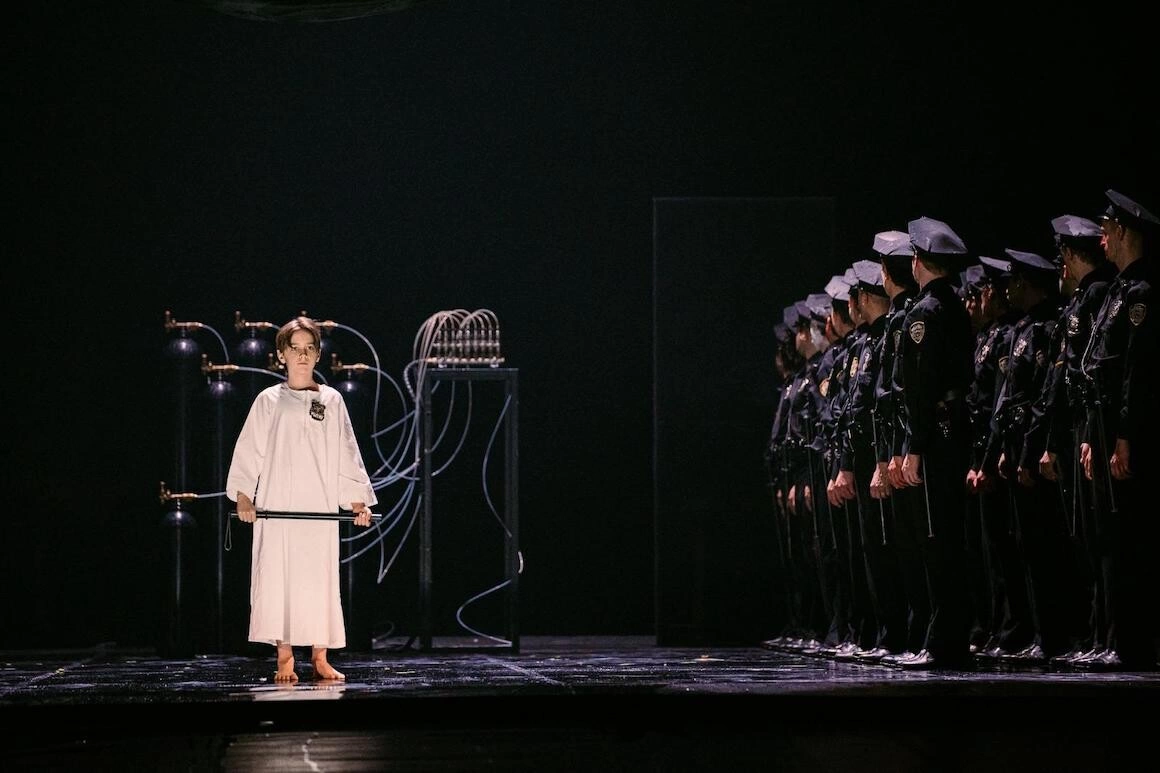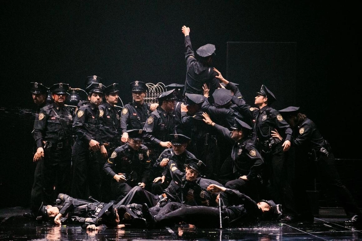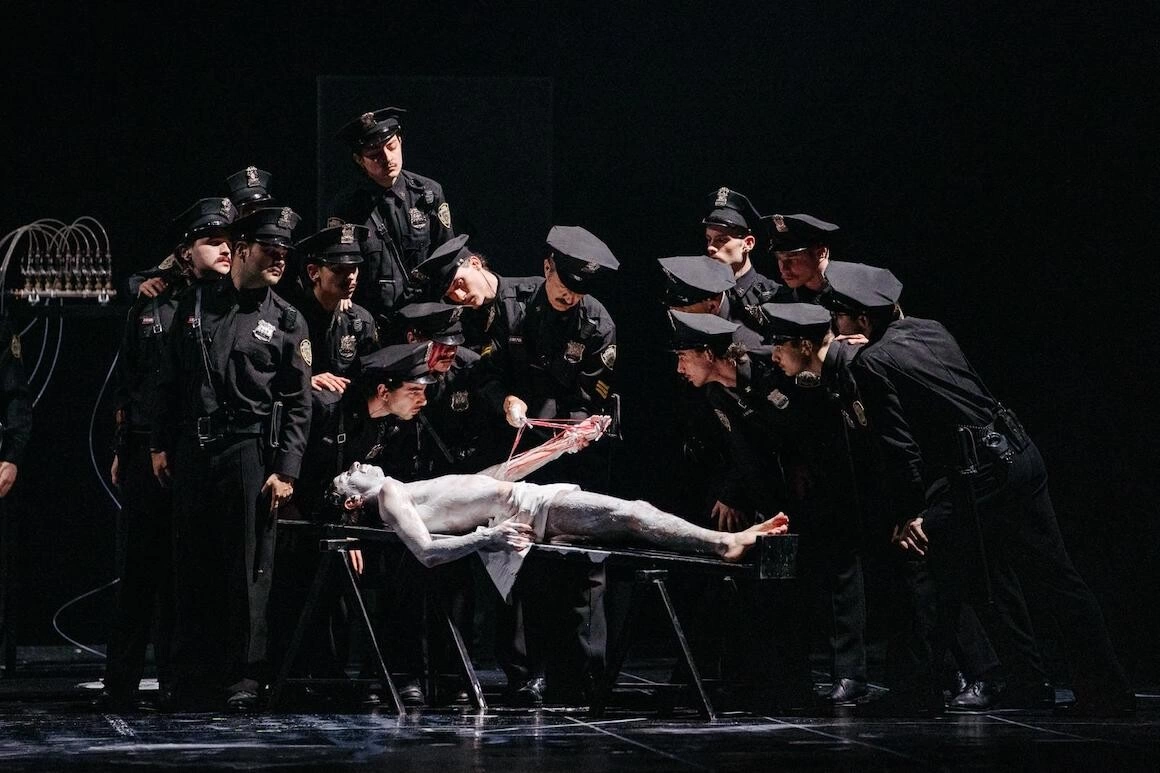 Bros este o construcție performativă pe multiple paliere. Spațiul e gol, populat uneori cu instalații metalice înfricoșătoare (un fel de sonar care seamănă cu cele puse pe tancuri și care devine aproape umanoid, ca un robot de supraveghere) sau dimpotrivă, încântătoare (un soi de orgă cu tuburi flexibile care scot apă și aburi în timp ce cântă) și cu fotografii imense, impresionante, toate portrete. Samuel Beckett, maestrul non-narativului, non-conflictului și non-personajului, al absurdului și al vieții ca o agonie inutilă; un profil de femeie tânără, un bărbat cu spatele, un gibon (cred) cu o privire scrutătoare, care pozează „artistic”. O marionetă figurativă, un copil de lemn în mărime naturală apare ca lider al polițiștilor cu care comunică prin țipete (e o caricatură de Hitler). Spațiul este întunecat, luminat doar la nivel de penumbră, uneori cu spoturi strict orientate care scrutează zona (ca reflectoarele din închisori care verifică zona de detenție), cu neoane, a căror lumină rece este intimidantă. Personajul principal este grupul de polițiști în uniforme închise la culoare, o frăție a masculinității agresive, acești Bros (de la brothers) se mișcă sincron sau formează tablouri complexe, multe violente, unele fiind replici vivante ale unor picturi celebre (Lecția de anatomie a doctorului Tulp de Rembrandt, cred că am văzut și un Rond de noapte, sunt multe picturi cu patimile lui Hristos). În contrapunct, sunt trei personaje în alb: profetul Ieremia (Valer Dellakeza), un tânăr adult, nud, victimă a poliției, care este bătut cu sălbăticie într-o scenă care amintește de patimile lui Iisus, și un copil. Vocea lui Ieremia se pierde în vâltoarea violenței, iar violența, după se poate citi în textul primit la intrare de fiecare spectator, vine de la însuși Domnul: „Ciocan ai fost pentru mine, unealtă de război; / cu tine am lovit popoarele și ți-am distrus regatele, / cu tine am lovit în cal și călăreț, cu tine am lovit calul și pe vizitiu...”. Imaginea lui Dellakeza în alb, cu barba sa impunătoare, este a unui profet rătăcit, care primește oarecum mirat ordinele unui Dumnezeu răzbunător pe slăbiciunea umană.