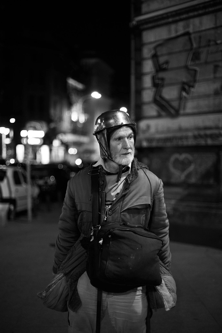 Am reușit cu greu să-l conving să mă lase să-l iau la întrebări despre fotografiile lui și nu mă aștepam ca ieșirea noastră să fie fix pe străzile pe care le bate aproape în fiecare seară. Ne-am întâlnit în fața teatrului Odeon și am pornit în sus pe Victoriei, am făcut dreapta pe Dacia până la Romană, am coborât pe Magheru și până la urmă am ieșit tot în Victoriei, la Novotel. Am povestit amândoi în tot timpul ăsta, iar eu trăgeam de timp așteptând să-și mute aparatul de la umăr la ochi. Mi-am dat seama că nu o să facă asta cu mine acolo, pentru c-ar fi fost mult prea show off pentru el, așa că ne-am așezat la discuții în Cișmigiu.